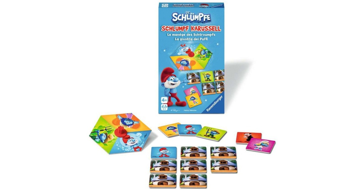 In diesem lustigen Merkspiel geht es für kleine Schlumpf-Fans ab vier Jahren rundherum. Mit Geschick und etwas Glück halten die Spieler die kreisende Oberfläche des Karussells durch Antippen an. Auf welchen Schlumpf zeigt der Finger? Dieser soll unter den ausliegenden Karten gefunden werden. Wer richtig liegt, darf die Karte behalten. Ansonsten muss sie umgedreht zurück auf den Platz gelegt werden. Es lohnt sich, sich gut zu merken, welche Karten bereits aufgedeckt wurden und wo welcher Schlumpf wohnt. Neben einem guten Gedächtnis erleichtert auch Schlumpfine die Suche. Doch aufgepasst, irgendwo hat sich auch Gargamel versteckt und der will bestimmt nichts Gutes. Die Spannung steigt. Wer bringt die meisten Schlümpfe nach Hause? Art.-Nr.: 1894561