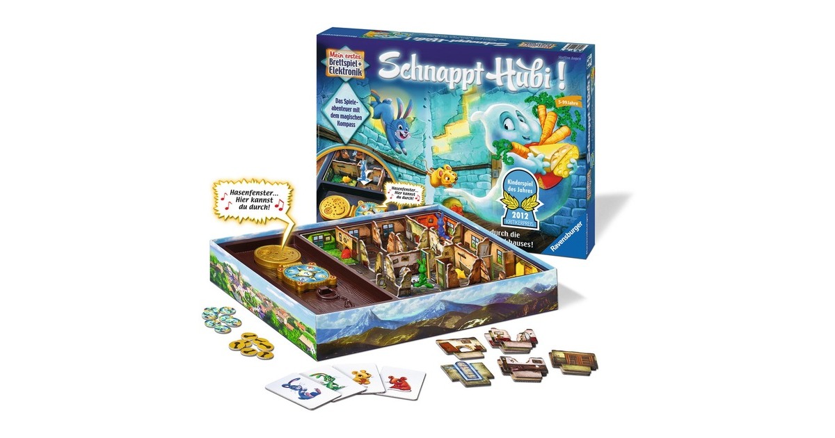 Bei Schnappt Hubi hat dieser schon wieder die Leckerbissen gehamstert! Kann man Hubi gemeinsam im Spukhaus fangen? Die Wände sind tückisch: mal kommt man durch, mal muss man einen anderen Weg suchen. Man muss Hubi auf der Spur bleiben und noch vor Mitternacht fangen! Die Bewohner und der magische Kompass helfen einem. Durch die intelligente Elektronik verläuft jedes Spiel anders. Art.-Nr.: 1187082
