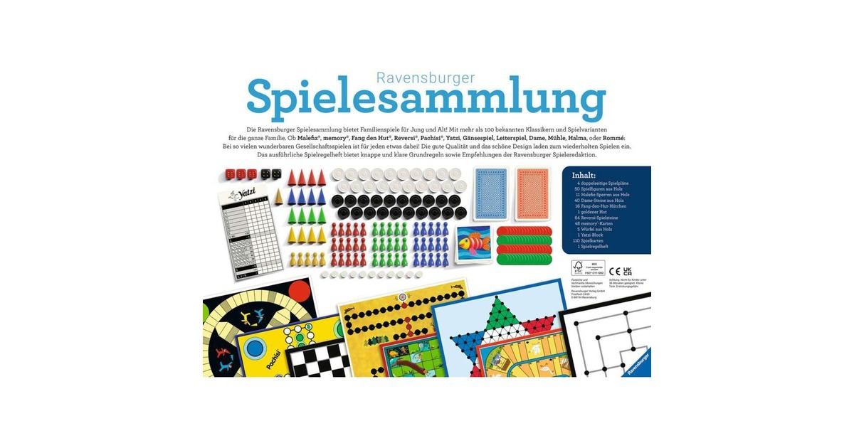 Diese Spielesammlung von Ravensburger ist das Rundum-Sorglos-Paket für den Spieleabend oder verregnete Nachmittage. Sie enthält mehr als 100 Spielmöglichkeiten, darunter Klassiker wie Mühle, Halma, Dame, Fang den Hut und vieles mehr. Dabei ist für jeden etwas dabei: Kurze Spiele, Spiele für gesellige Runden oder Spiele für längere Beschäftigung - für Jung und Alt.Art.-Nr.: 1828775