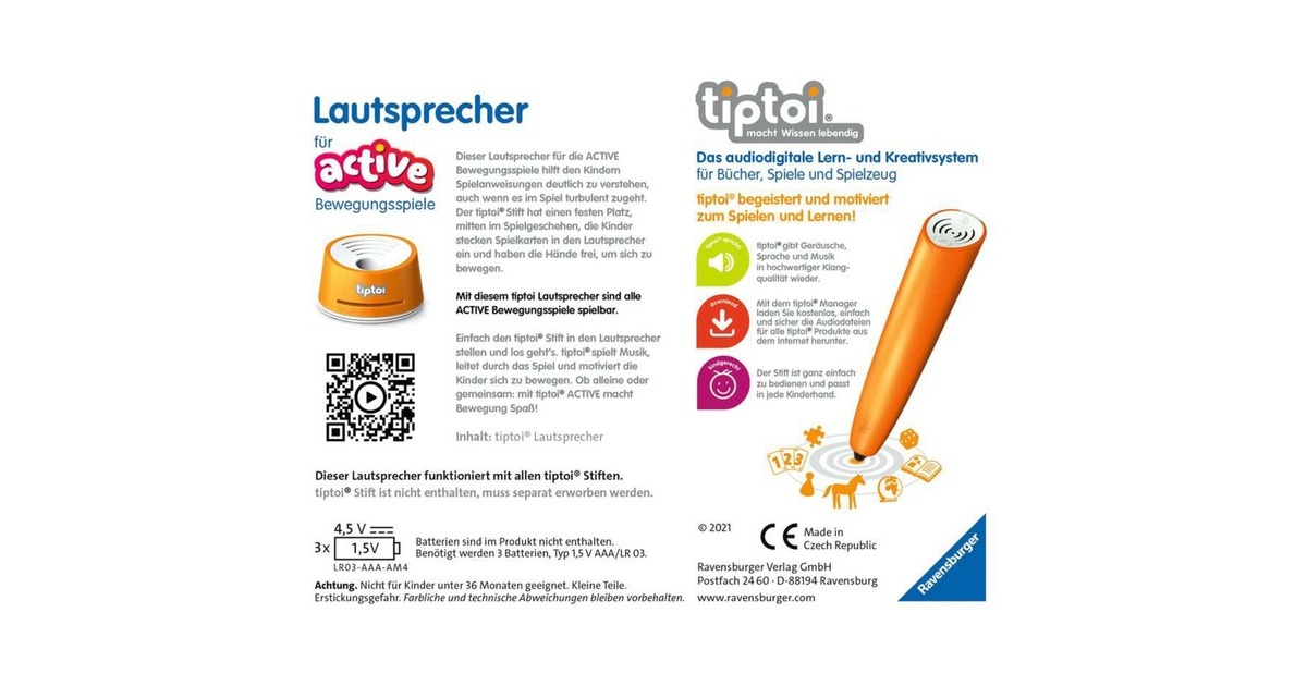 Mit dem tiptoi Lautsprecher können alle Spiele der ACTIVE Reihe gespielt werden, Dieser Lautsprecher funktioniert mit allen tiptoi-Stiften. |