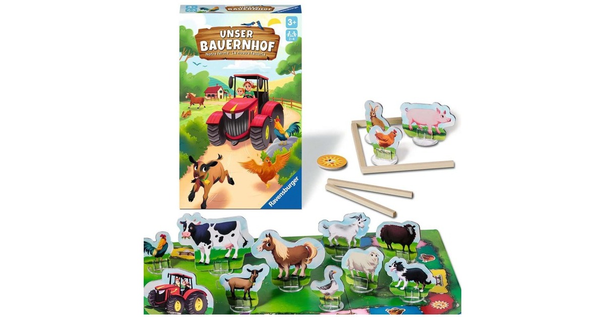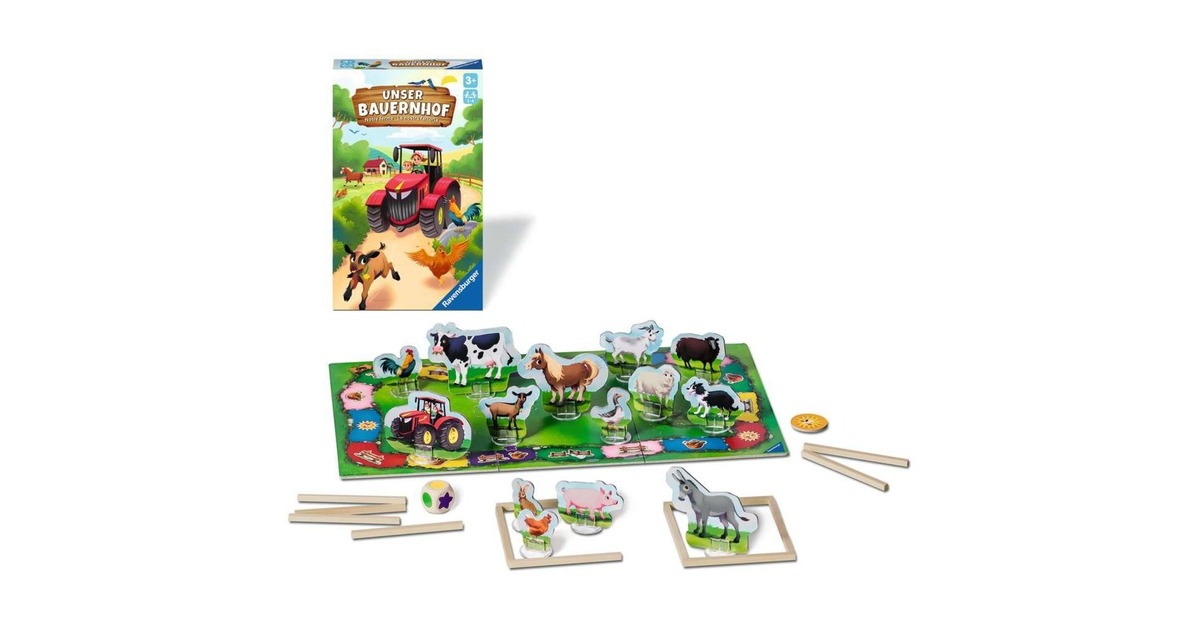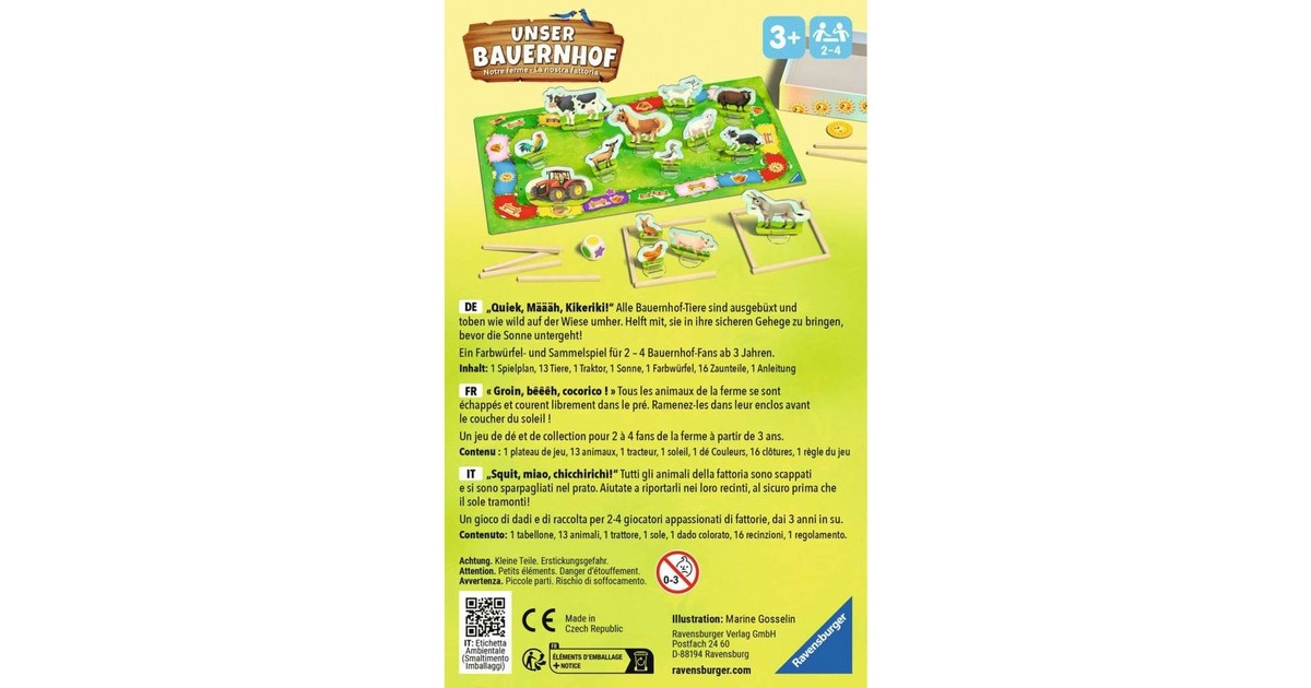 Ein niedliches Kinderspiel rund um das Leben auf dem Bauernhof. Bäuerin Frieda sind alle Tier entwischt - nun toben sie auf der Wiese hinter dem Bauernhof. Alle müssen nun helfen, um die Tiere wieder in ihre Ställe zu bringen. Los geht`s mit dem roten Traktor - aber möglichst schnell, denn alle Tiere müssen wieder im Stall sein, wenn die Sonne untergeht! Bei diesem Farbwürfel- und Sammelspiel gibt es auf jedem Feld eine Aktion: Mal darf man ein Tier mit Leckerlis von der Weide zu sich locken, mal ein Zaunteil aus dem Vorrat nehmen. Bei einem Joker können die Kinder aus diesen beiden Möglichkeiten wählen. Doch landet der Traktor bei der Sonne, wandert diese etwas weiter in Richtung Sonnenuntergang. Wenn vorher alle Tiere im Stall versorgt sind, haben alle gemeinsam gewonnen! Für etwas ältere Kinder gibt es eine Wettbewerbsregel, bei der der Spieler mit den meisten Tieren gewinnt.Art.-Nr.: 100038828