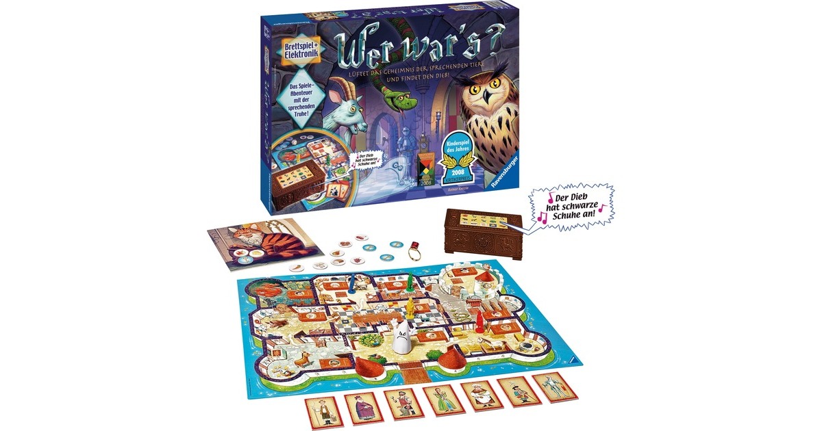 Bei dem Brettspiel Wer war's? helfen die sprechenden Tiere, durch Hinweise den Spielern den Dieb des magischen Rings zu finden. Die intelligente Elektronik in der Truhe sorgt dafür, dass jedes Spiel anders verläuft und aufs Neue spannend ist. Wichtig ist das man sich gut konzentriert und den Tieren aufmerksam zuhört. Art.-Nr.: 1187080