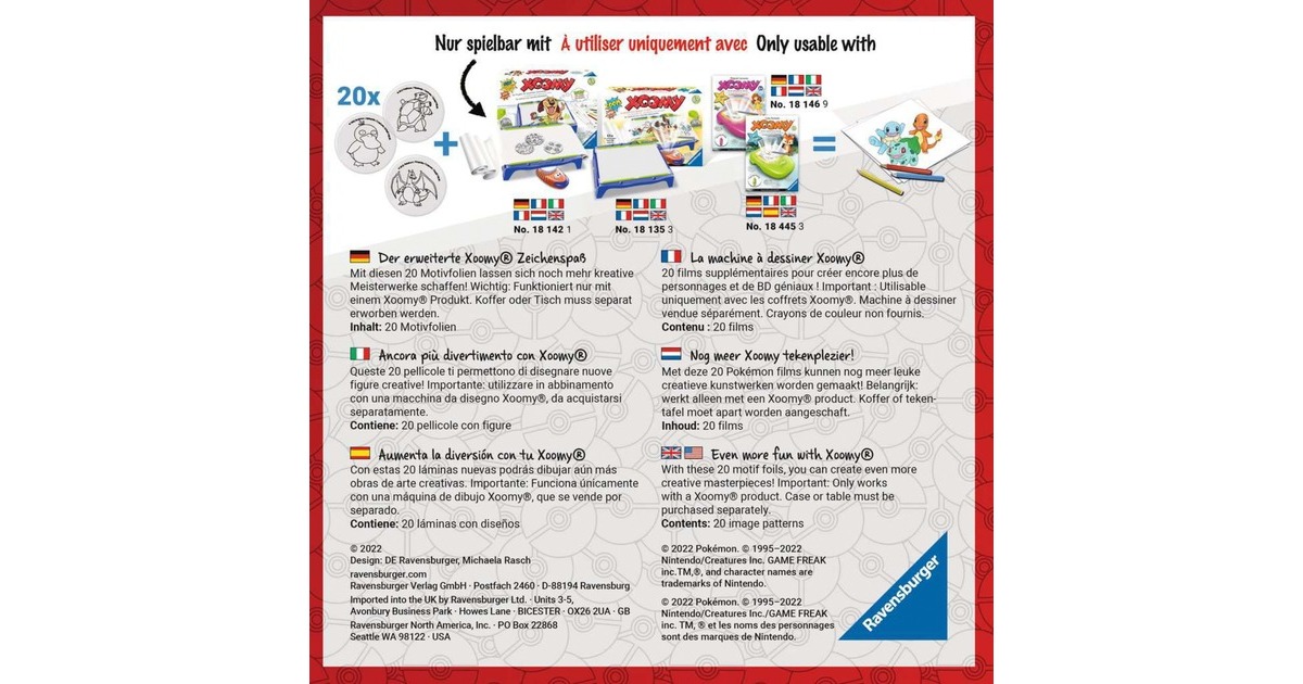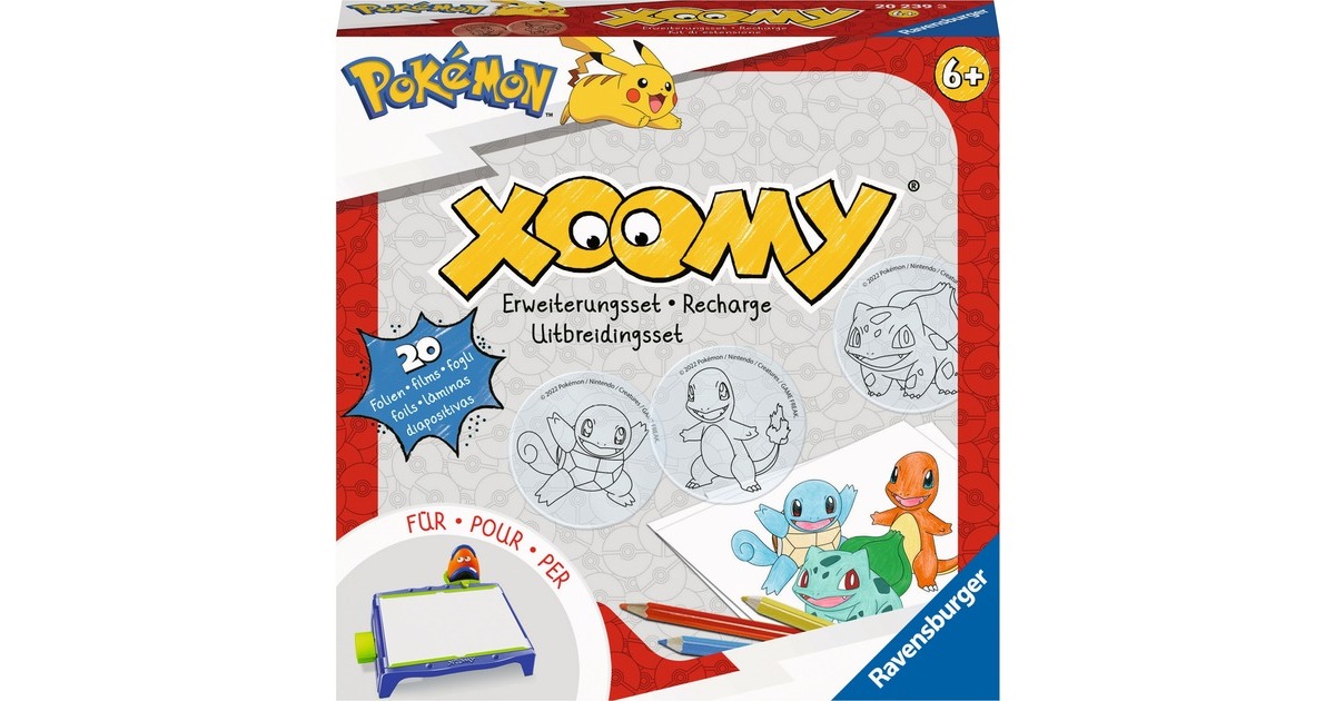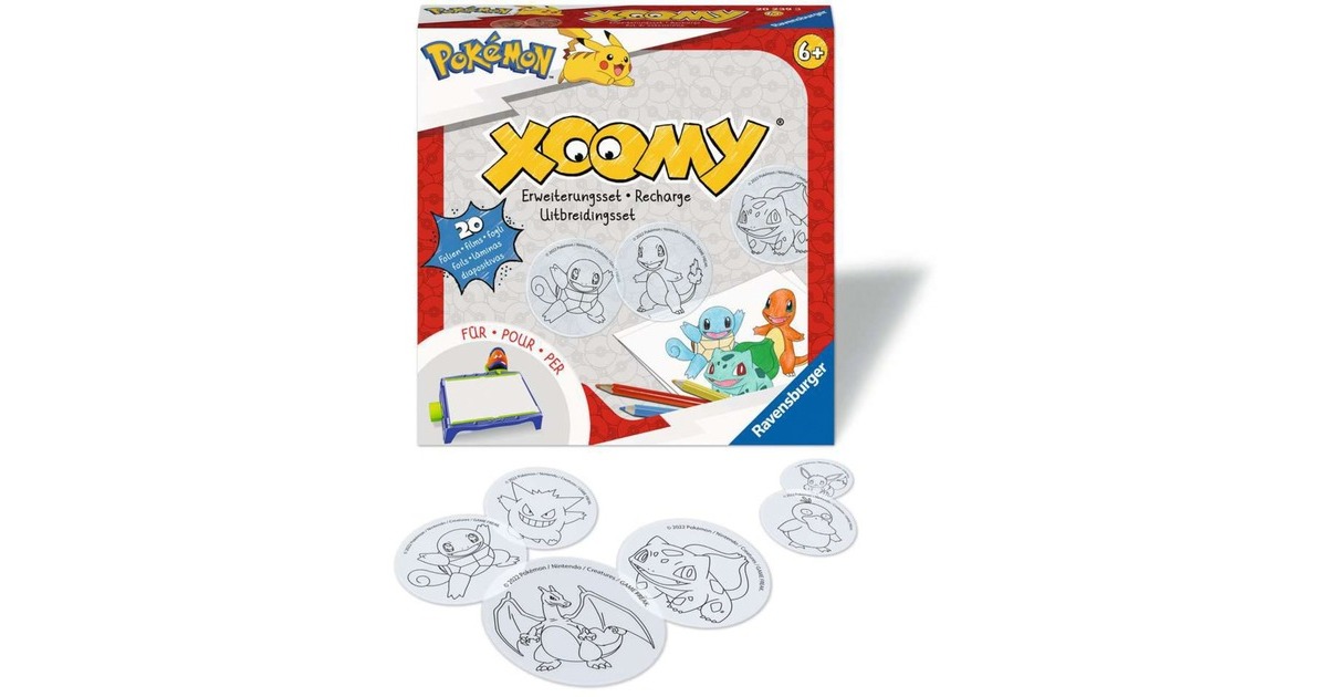 Mit dem Ravensburger Xoomy lernen Kinder ab 6 Jahren ganz einfach Zeichnen. In diesem Erweiterungsset stehen 20 neue Motive aus der Welt der von Pokémon zur Verfügung. Art.-Nr.: 1894786