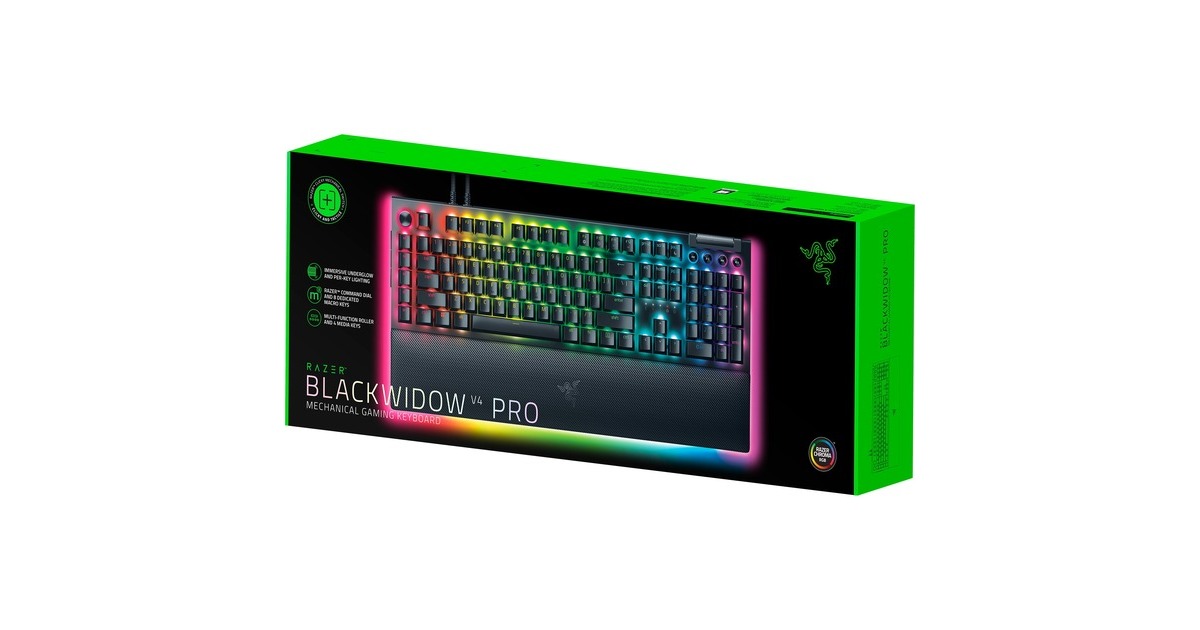 Mit der mechanischen Gaming-Tastatur BlackWidow V4 Pro von Razer erlebt man die nächste Phase der Battlestation-Evolution. Ihr eindrucksvoller Underglow und die Einzeltastenbeleuchtung wird angetrieben von Razer Chroma RGB und lässt sich mit dem gesamten Setup synchronisieren, um in Hunderten von integrierten Spielen eine bessere Immersion zu genießen. Dabei sorgt die magnetische weiche, gepolsterte Kunstleder-Handgelenkauflage für zusätzlichen Spielkomfort und Flair, denn sie erweitert das Unterlicht von zwei auf drei Seiten. Die Razer Green Mechanical Switches der BlackWidow V4 Pro ermöglichen eine präzise Ausführung mit klickendem, taktilem Gefühl. Mit einem 1,9-mm-Betätigungspunkt, der nur 50 g Kraft erfordert, erlebt man die perfekte Kombination aus Druck und Reaktionszeit für präzise Eingaben mit zufriedenstellendem, taktilem Feedback. Das Doubleshot-Gussverfahren der ABS-Tastenkappen sorgt dafür, dass sich die Beschriftung nicht abnutzt, und die besonders dicken Wände machen die Tastenkappen extrem widerstandsfähig, damit sie auch intensiver Nutzung standhalten. Der programmierbare Razer Command Dial mit bis zu 100 anpassbaren Modi und acht dedizierte Makro-Tasten bieten maximale Befehlsgewalt und die Multifunktionswalze sowie vier Medien-Tasten ermöglichen eine bequeme und umfassende Medien-Steuerung. Darüber hinaus verfügt die BlackWidow V4 Pro über einen USB-2.0-Passthrough und einen hybriden On-Board-Speicher für bis zu fünf Profilen.Art.-Nr.: 1898260