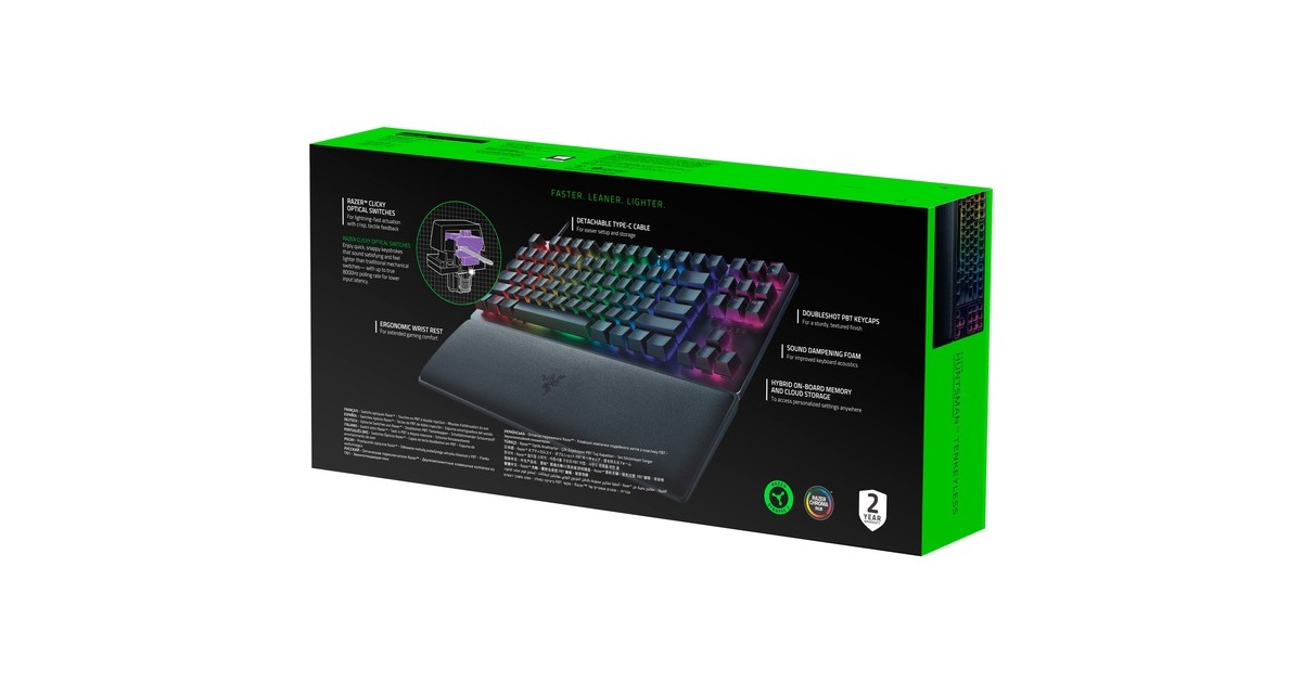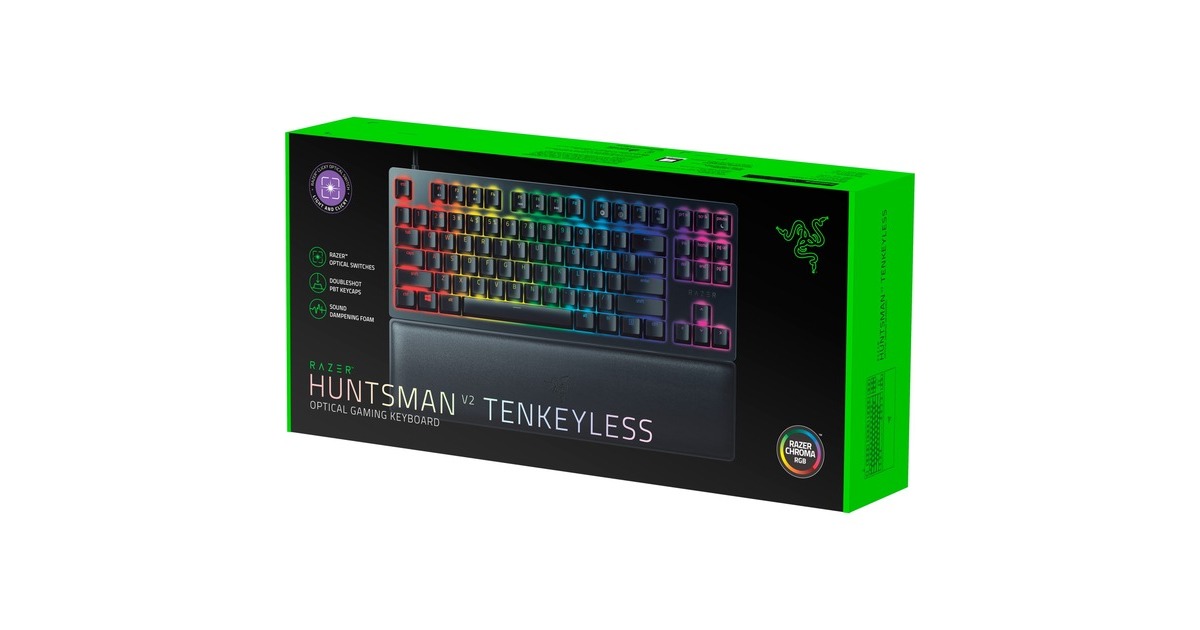 Die Razer Huntsman V2 TKL ist eine praktisch latenzfreie optische Gaming-Tastatur ohne Ziffernblock für konkurrenzlose Geschwindigkeit. Die klickenden optischen Switches von Razer bieten blitzschnelles Auslösen mit knackig-taktilem Feedback. Sie sorgen für schnelle, leicht von der Hand gehende Tastenanschläge, die sich satt anhören und leichter anfühlen als traditionelle mechanische Switches, und dank der Razer HyperPolling-Technologie haben sie eine Abtastrate von echten 8.000 Hz für praktisch latenzfreie Eingaben. Die PBT-Tastenkappen werden aufgrund des Doubleshot-Gussverfahrens mit der Zeit auch nicht blank und die Beschriftung wird niemals verblassen oder sich abnutzen. Für einen noch besseren Sound beim Tippen hat die Huntsman V2 TKL in ihrem Gehäuse eine Schicht Spezialschaumstoff, der alle metallischen Geräusche absorbiert, die beim Drücken der Tasten auftreten können. Die gepolsterte Handballenauflage aus Kunstleder richtet sich perfekt an der Tastatur aus und entlastet die Handgelenke, damit auch bei längeren Gaming-Sessions keine Ermüdungserscheinungen auftreten. Der integrierte Hybrid-Speicher und Cloud-Speicher ermöglicht sofortigen Zugriff auf persönliche Einstellungen – immer und überall. Und dank der Razer Hypershift-Technologie lassen sich doppelt so viele Tasten programmieren. Darüber hinaus kann die Razer Chroma RGB-Beleuchtung der Huntsman V2 TKL per Chroma Studio noch mehr erweitert und die Beleuchtungseffekte mit allen Geräten, die Razer Synapse 3 unterstützen, synchronisiert werden.Art.-Nr.: 1783119