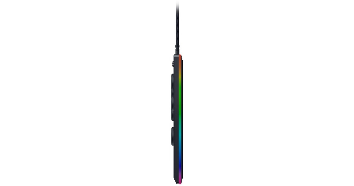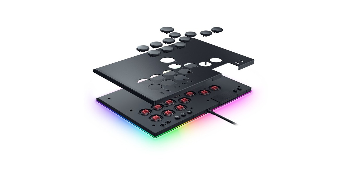 Tasten mit Razer Low Profile Linear optical Switches, vier Bewegungstasten statt eines Joysticks, Spange zur Sicherung des Kabels, abnehmbares Aluminium-Oberteil, Unterstützung für Razer Chroma RGB, abnehmbares USB-Kabel |