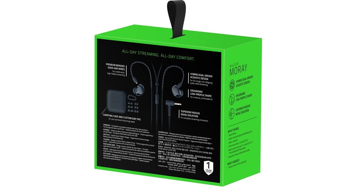 Wenn man 24/7 streamen möchte, braucht man den Komfort und die Qualität des Razer Moray – einem ergonomischen In-Ear-Ohrhörer für lange Streaming-Sessions. Dank eines Hybrid-Dual-Treiber-Designs lässt sich Sound in Hi-Fi-Qualität genießen, ohne die Ohren zu strapazieren. So wird die Community stundenlang bestens unterhalten. Mit einem Balanced-Armature-Treiber für knackige Höhen und einem dynamischen Treiber für einen satten Bass sorgt das 2-Wege-Crossover-Design des Moray für einen außergewöhnlichen Klang und stundenlanges Streaming. Das ergonomische Design des Moray ist perfekt an die Anatomie des menschlichen Ohrs angepasst und sitzt optimal, damit man auch bei längeren Streaming-Sessions stets fit bleibt – anders als bei Headsets, die Druck auf Kopf und Ohren ausüben. Das Moray bietet zudem beste passive Schallisolierung und verfügt über abnehmbare OFC MMCX-Kabel mit biegsamen Memory-Loop-Hüllen, die sicher über den Ohren sitzen und beim Streaming nicht in die Quere kommen. Zwei verschiedene Arten von Ohrstöpseln in jeweils drei Größen sorgen für maximalen Komfort und Schallisolierung und dank dem handlichen und gegen Spritzwasser geschützten Transport-Etuis kann man immer und überall kreativ sein.Art.-Nr.: 100005793
