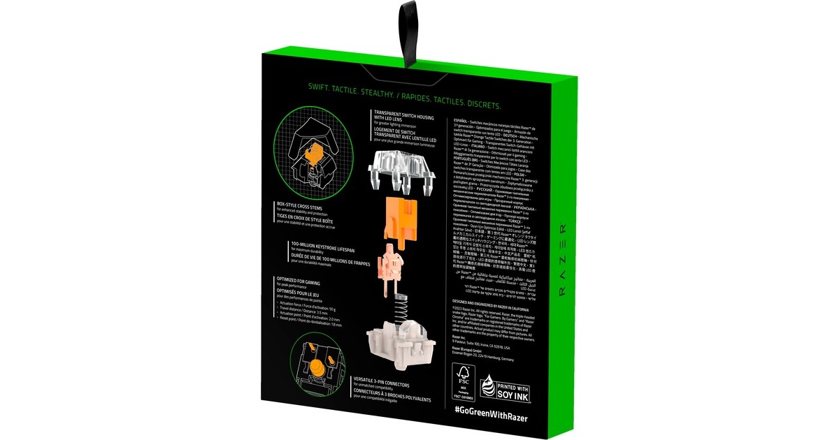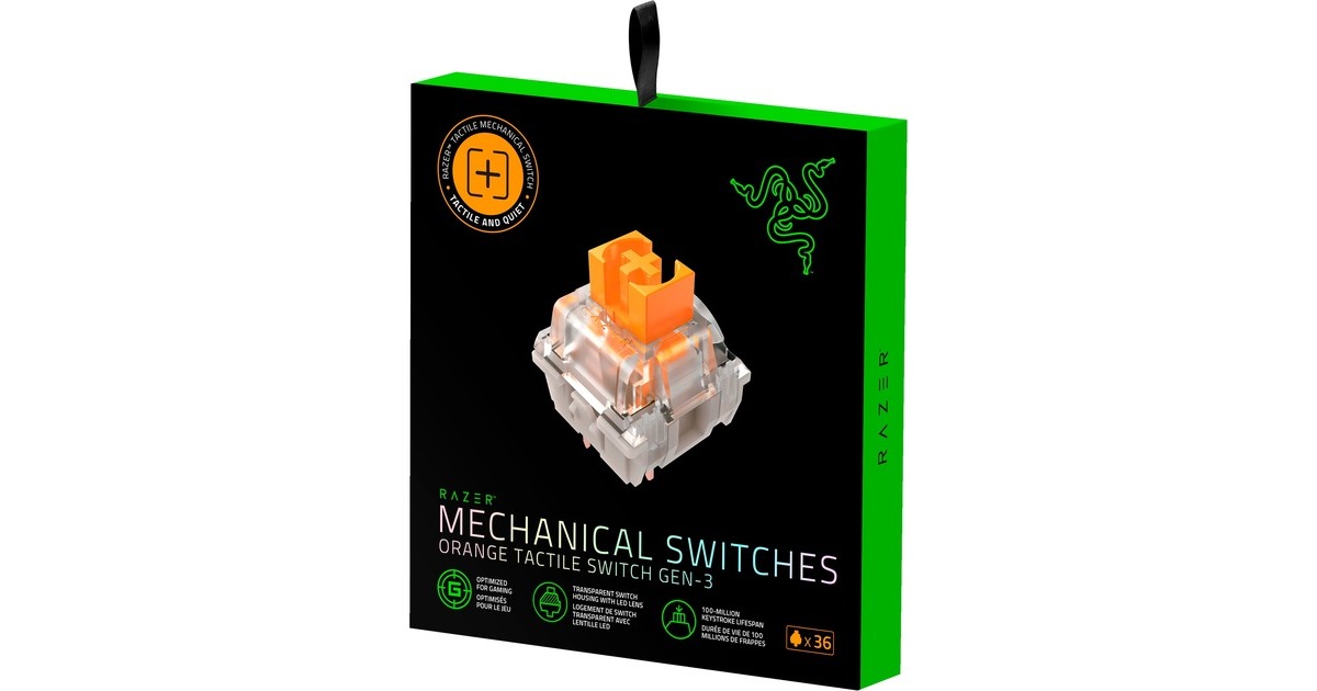 Der mechanische Switch von Razer setzt Standards in Sachen Gaming. Nun gibt es diese Switches auch zum Erstellen einer individuellen Tastatur - in Packs mit jeweils 36 Stück und mit verschiedenen Charakteristiken. Diese Switches verfügen über ein transparentes Gehäuse, damit die LED-Beleuchtung richtig zur Geltung kommt. Sie sind für 100 Millionen Tastenbelegungen ausgelegt und mit Kreuz-Schäften ausgestattet, womit sie kompatibel zu den meisten Tastenkappen sind. Dieses Set enthält taktile Orange Switches, die sich durch präzises Auslösen und geringe Geräuschentwicklung auszeichnen. Art.-Nr.: 100008077