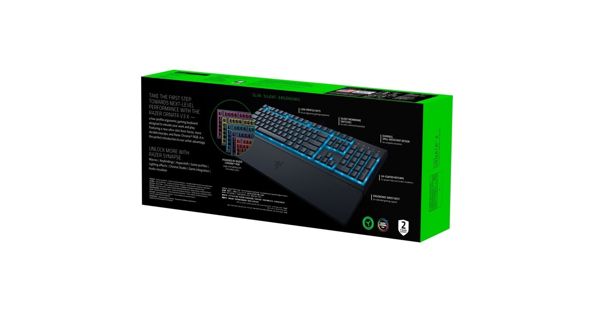 Die Razer Ornata V3 X ist eine ultraschlanke, ergonomische Low-Profile Gaming-Tastatur, die das beste aus beiden Welten für Spiel und Arbeit vereint. Ihre schlankeren Tastenkappen und kürzeren Schalter ermöglichen eine natürliche Handhaltung, die eine stundenlange Nutzung bei geringer Belastung ermöglicht. Die lautlosen Membran-Switches sorgen für weiche, gefederte Tastenanschläge, was ideal für alle ist, die es beim Gaming oder Tippen lieber etwas leiser haben. Die Anti-UV-Beschichtung der ABS-Tastenkappen sorgt für verbesserte Widerstandsfähigkeit gegen Verblassen und Kratzer und bietet im Vergleich zu herkömmlichen Tastenkappen einen größeren Schutz vor Abnutzung durch häufigen Gebrauch. Dank der Razer Hypershift-Technologie lässt sich die Anzahl anpassbarer Tasten der Ornata V3 X verdoppeln. Die anpassbare Razer Chroma RGB-Beleuchtung ermöglicht eine umfangreiche Individualisierung – die Lichteffekt können zudem mit allen anderen Razer-Synapse-3-fähigen Geräten synchronisiert werden. Die magnetische Soft-Touch-Handgelenkauflage lässt sich nahtlos in die Ornata V3 X einrasten und bietet ausreichend Komfort und Unterstützung für die Handgelenke.Art.-Nr.: 1846884