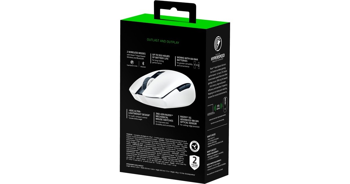 Optischer 5G-Sensor mit echten 18.000 DPI und 99,4 % Auflösungsgenauigkeit | Kabelloser Dual-Modus (2,4 GHz / BLE) | Razer HyperSpeed Wireless-Technologie für den Einsatz von zwei Geräten mit einem Adapter | 6 unabhängig programmierbare Tasten | Mechanische Maus-Switches der 2. Generation von Razer | Taktiles Mausrad in Gaming-Qualität | Symmetrisches Design | Standard-DPI-Stufen: 400/800/1600/3200/6400 | AA/AAA-Batteriefach (nur eine Batterie für den Betrieb) | Integrierter Speicher für DPI und Tastenbelegung | Unterstützt Razer Synapse 3 |
