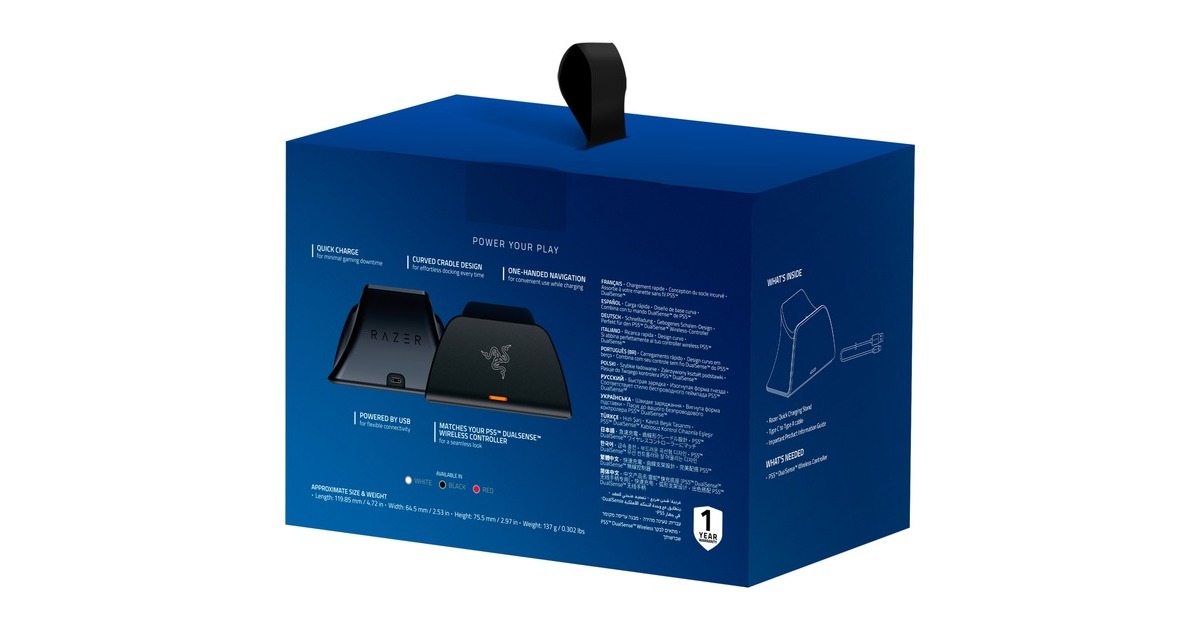 Wenn man den PS5 DualSense Wireless-Controller so schnell wie möglich wieder auf volle Power bringen möchte, dann ist die Razer Schnellladestation die ideale Lösung. Die Station kann den Controller in nicht mal 3 Stunden wieder voll aufladen und verfügt über einen Überladungsschutz um Überhitzung und Kurzschlüssen vorzubeugen. Dank eines gebogenen Schalen-Designs kann man den Controller andocken, ohne dass die Ladestation umfallen könnte. Die Ladestation hat außerdem ein ergonomisches Design, damit man den Controller auch im angedockten Zustand zum Bedienen der PS5-Menüs verwenden kann. Um dem Setup den letzten Schliff zu geben, setzt diese Ladestation auf die gleichen auffälligen Farben wie die DualSense Wireless-Controller. Man braucht nur die Ladestation mit einer PS5, einem PC oder einem kompatiblen Netzteil (separat erhältlich) zu verbinden, und schon kann's losgehenArt.-Nr.: 1798982