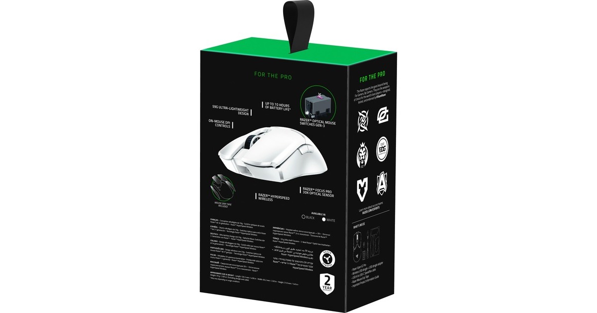Ultraleichte E-Sport-Maus mit symmetrischem Design, Auslösezeit von 0,2 ms ohne Entprellverzögerung, 5 programmierbare Tasten, Razer Hypershift-Technologie, 5 DPI-Stufen, 1 Onboard-Speicherprofil, Razer HyperSpeed Wireless Technologie, Plug & Play, bis zu 70 Stunden Akkulaufzeit |