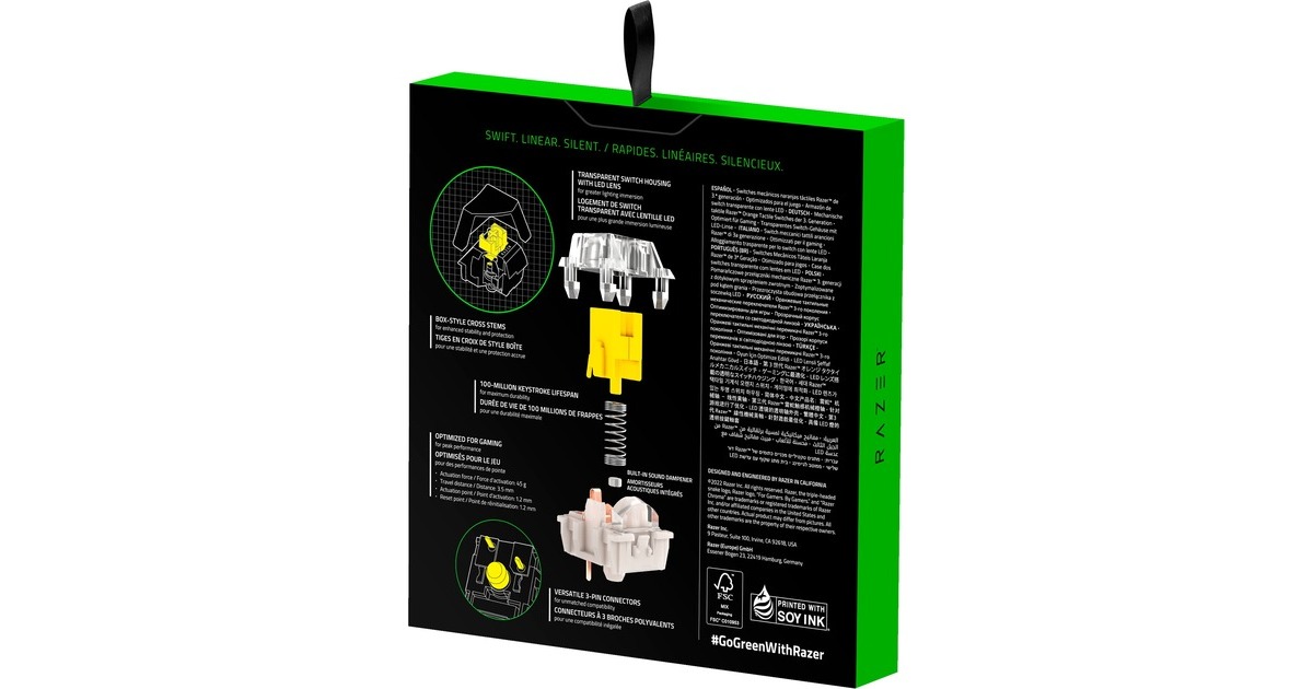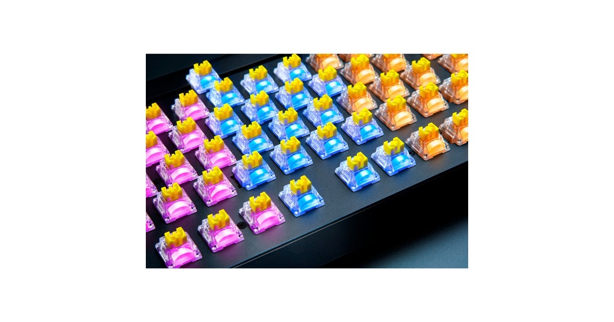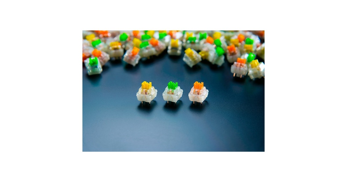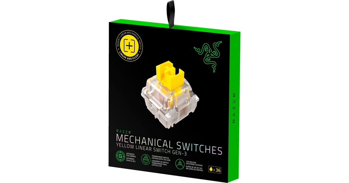 Der mechanische Switch von Razer setzt Standards in Sachen Gaming. Nun gibt es diese Switches auch zum Erstellen einer individuellen Tastatur - in Packs mit jeweils 36 Stück und mit verschiedenen Charakteristiken. Diese Switches verfügen über ein transparentes Gehäuse, damit die LED-Beleuchtung richtig zur Geltung kommt. Sie sind für 100 Millionen Tastenbelegungen ausgelegt und mit Kreuz-Schäften ausgestattet, womit sie kompatibel zu den meisten Tastenkappen sind. Dieses Set enthält Yellow Switches, die sich durch lineare Betätigung und geringe Geräuschentwicklung auszeichnen. Art.-Nr.: 100008074