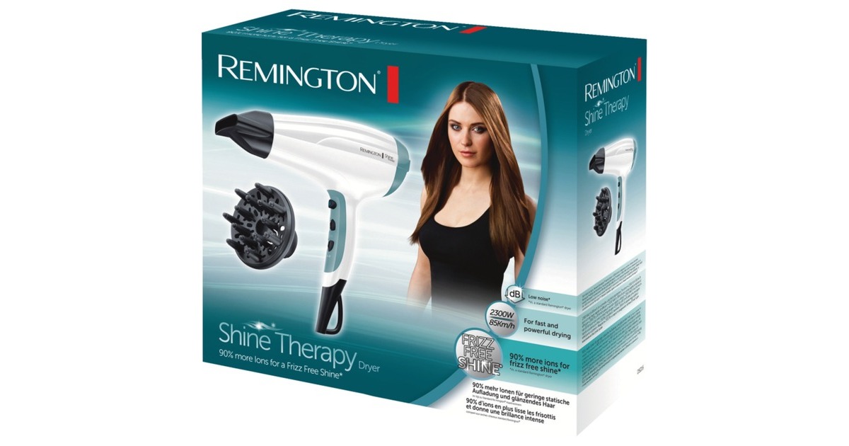 Der Shine Therapy D5216 Ionen-Haartrockner von Remington ist mit einem leistungsstarken 2300 Watt Motor ausgestattet. Der 85 km/h Luftstrom sorgt für ein schnelles Trocknen der Haare. Zusätzlich ist der Ionen-Haartrockner mit drei Heiz- und zwei Gebläsestufen sowie einer Abkühlstufe ausgestattet. Der Ionen-Generator des Shine Therapy Haartrockners D5216 produziert 90% mehr Ionen (im Vergleich zu Standard Remington Haartrocknern) und reduziert die statische Aufladung, lässt das Haar schneller trocknen und sorgt für unvergleichbaren Glanz. Die 9 mm Stylingdüse und der Diffusor runden das perfekte Paket zum Trocknen der Haare ab. Der abnehmbare, leicht zu reinigende Luftfilter und eine Aufhängeöse sorgen außerdem für eine komfortable Handhabung und Reinigung.Art.-Nr.: 1776140