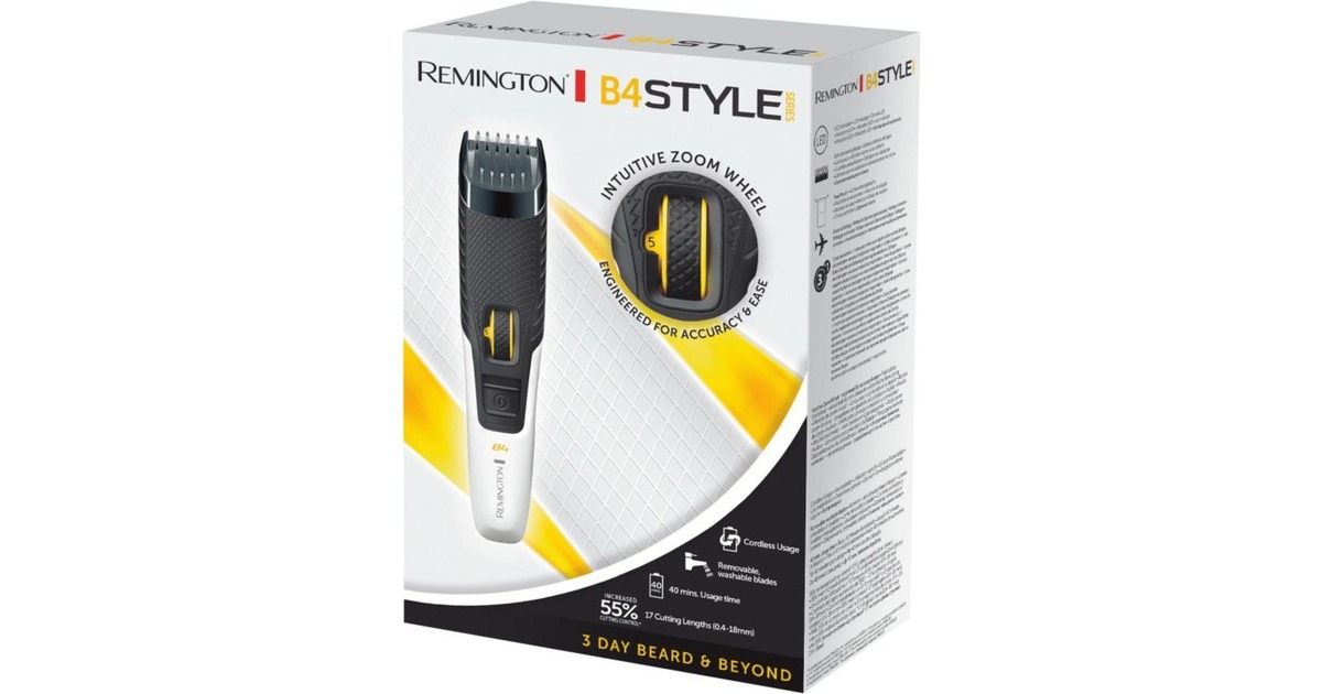 Der Style Series B4 MB4000 Bartschneider von Remington eignet sich perfekt für ein präzises Styling. Das Intuitive Zoom-Rad und der verstellbare Kamm wurden entwickelt, um Genauigkeit und Präzision in die Grooming-Routine zu bringen. Durch das Rad kann mühelos die gewünschte Länge zwischen 17 präzisen Längeneinstellungen gewählt werden, um jeden Stil vom 3-Tage-Bart bis hin zu einem gepflegten Vollbart zu erreichen. Die selbstschärfenden ComfortTip-Klingen wurden so konzipiert, dass sie sanft zur Haut sind und trotzdem scharfe Ergebnisse liefern. Mit der kabellosen Laufzeit von 40 Minuten hat man immer Zeit, den eigenen individuellen Look zu pflegen. Wenn es an der Zeit ist, den Bartschneider zu reinigen, muss einfach die Klinge abgenommen und unter fließendem Wasser abgewaschen werden. Art.-Nr.: 1679517