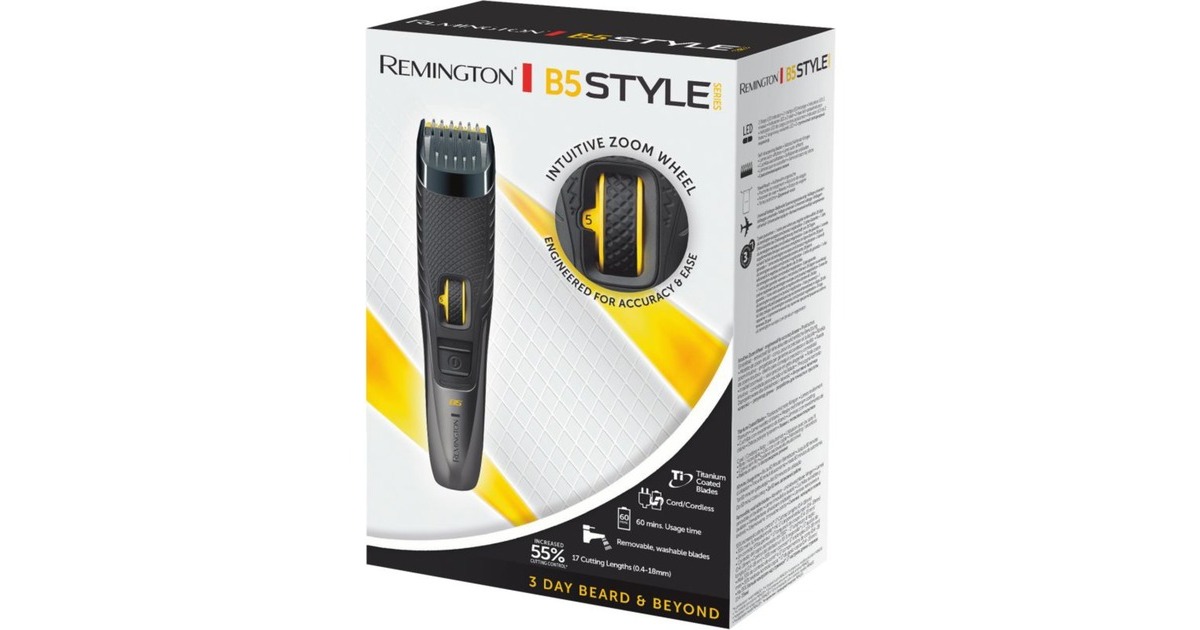 Mit dem Style Series B5 MB5000 Bartschneider von Remington wird der eigene Look perfektioniert. Das Intuitive Zoom-Rad und der verstellbare Kamm wurden entwickelt, um Genauigkeit und Präzision in die Grooming-Routine zu bringen. Durch das Rad kann mühelos die gewünschte Länge zwischen 17 präzisen Längeneinstellungen gewählt werden, um jeden Stil vom 3-Tage-Bart bis hin zu einem gepflegten Vollbart zu erreichen. Die selbstschärfenden, titanbeschichteten ComfortTip-Klingen wurden so konzipiert, dass sie sanft zur Haut sind und trotzdem scharfe Ergebnisse liefern. Mit der kabellosen Laufzeit von 60 Minuten hat man immer Zeit, den eigenen individuellen Look zu pflegen. Bei entladenem Akku lässt sich der Bartschneider jedoch auch im Netzbetrieb weiter verwenden. Wenn es an der Zeit ist, den Bartschneider zu reinigen, muss einfach die Klinge abgenommen und unter fließendem Wasser abgewaschen werden.Art.-Nr.: 1679525