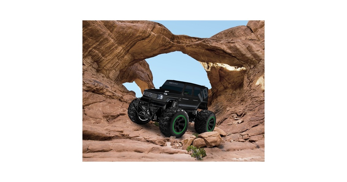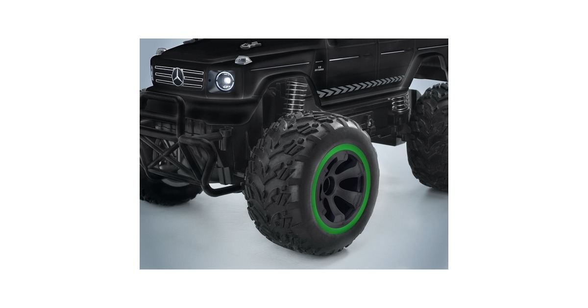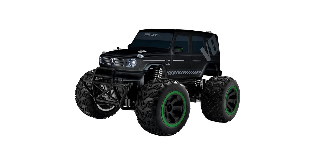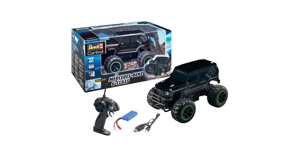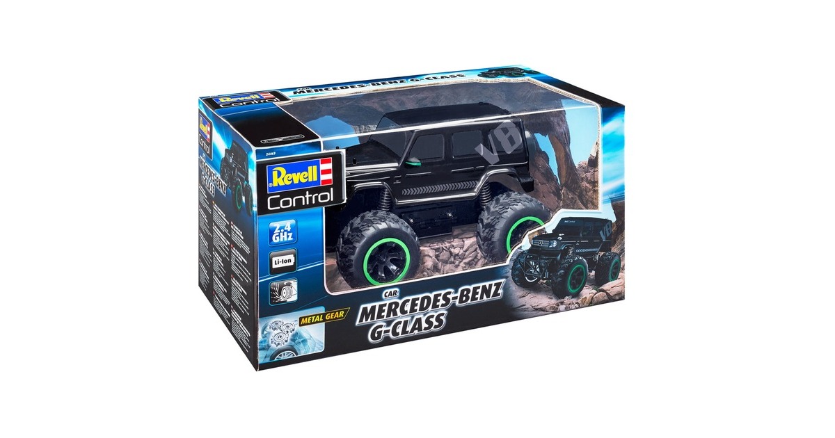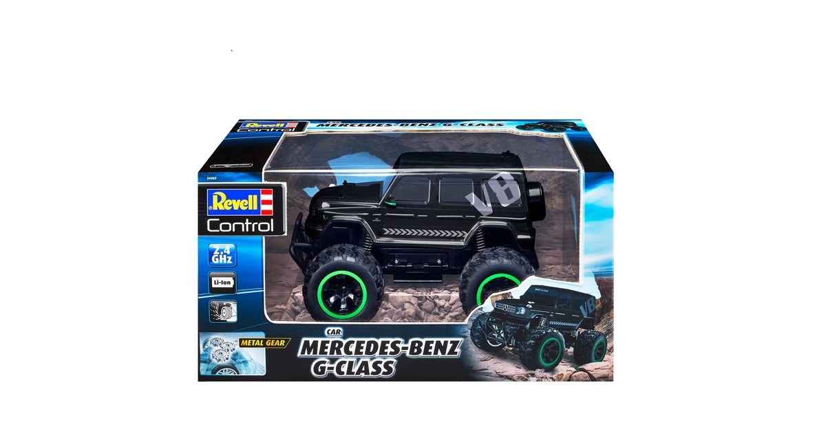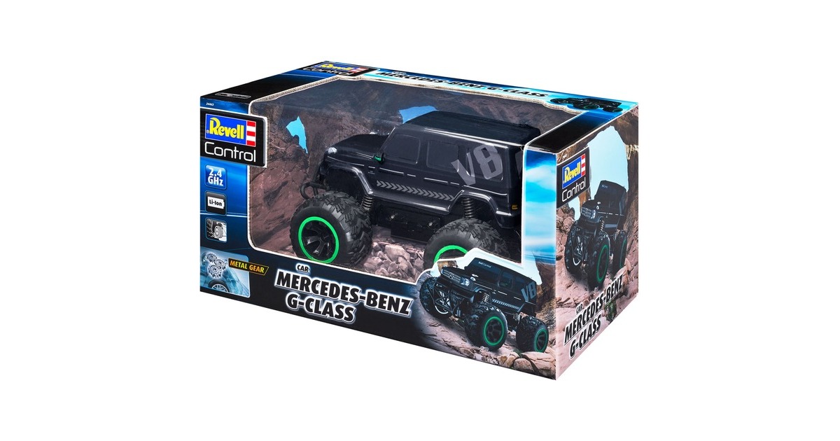 Seit über 40 Jahren steht der Mercedes G für Perfektion und Geländegängigkeit. Seine unverkennbare Karosserie macht den Mercedes G zum Unikat. Der lizensierte Mercedes G von Revell Control ist die perfekte Kombination zwischen Scale-Karosserie und Monstertruck. Die bulligen Reifen, die spritzwassergeschützte Technik mit dem robusten Metallgetriebe bringen auch das Modell durch jedes Gelände. Dank der 2,4-GHz-Technik können auch mehrere Fahrzeuge gleichzeitig fahren, somit ist dem Spielspaß keine Grenze gesetzt. Der enthaltene Akku kann nach jeder Fahrt einfach mit dem USB-Ladegerät wieder geladen werden.Art.-Nr.: 1585686