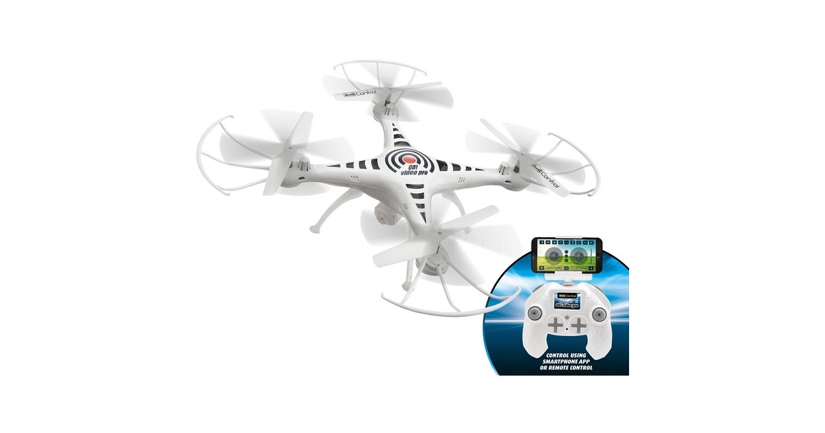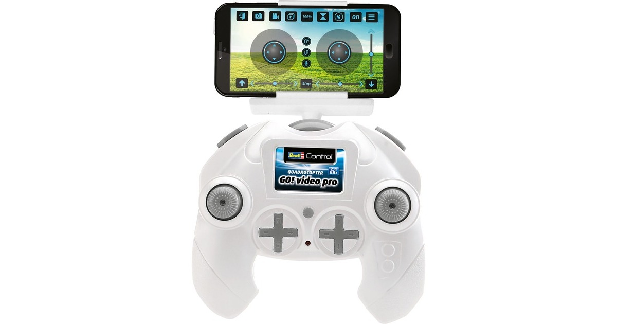 Der Revell Quadcopter GO! VIDEO PRO ist ein Quadrocopter mit HD-Kamera für Foto- und Videoaufnahmen. Er startet per Knopfdruck auf eine vordefinierte Flughöhe und hält diese mit Hilfe seines eingebauten Höhensensors. Für die präzise Steuerung sorgt die 4-Kanel-GHz-Fernstererung. An dieser Fernsteuerung kann ein Smartphone befestigt werden und mit Hilfe der Gratis-App wird das Livebild der Quadrocopter-Kamera (720p) direkt auf das Smartphone übertragen. Der kraftvolle Lithium-Ionen-Akku wird bequem über ein USB-Ladekabel aufgeladen. Ersatzrotorblätter sind im Lieferumfang enthalten. Der Quadcopter GO! VIDEO PRO ist wahlweise steuerbar über die beiliegende Fernsteuerung oder einem eigenem Smartphone.Art.-Nr.: 1725504