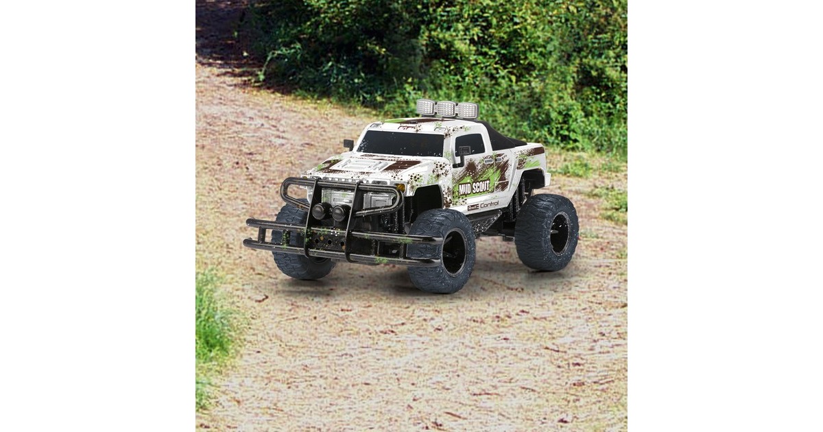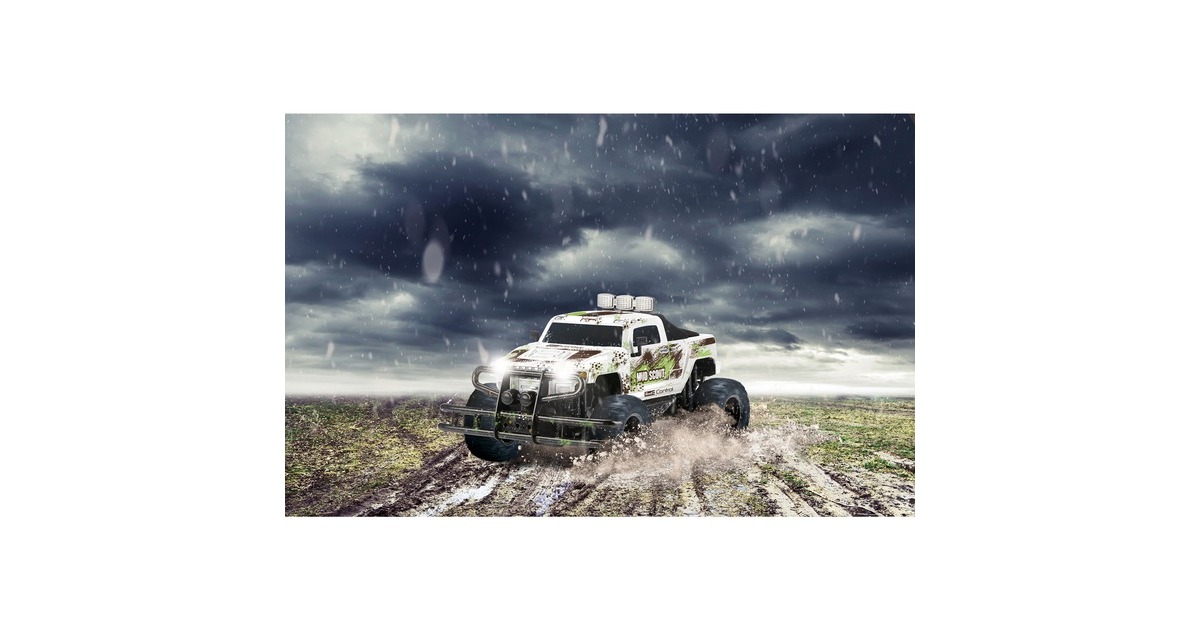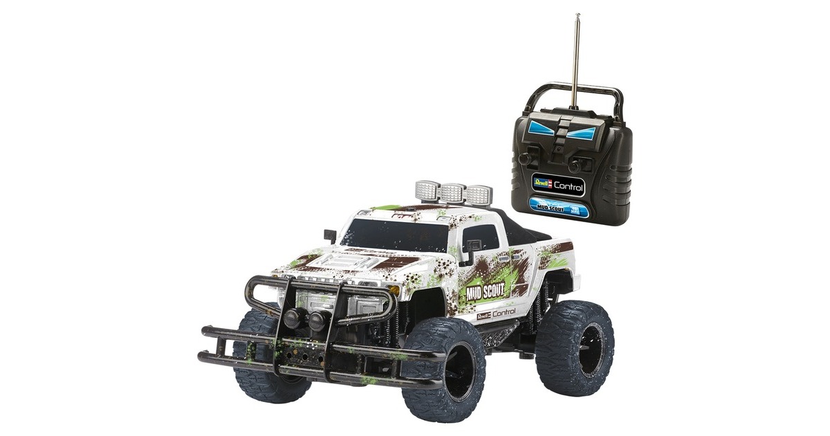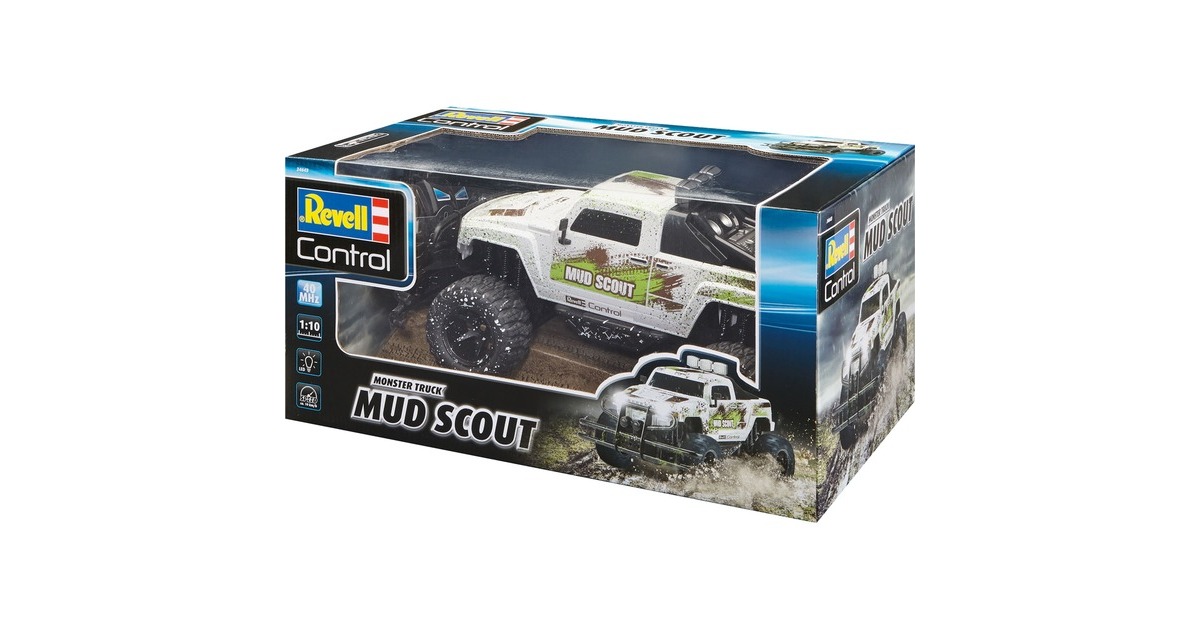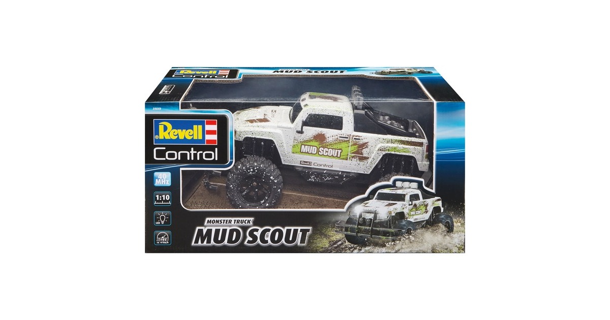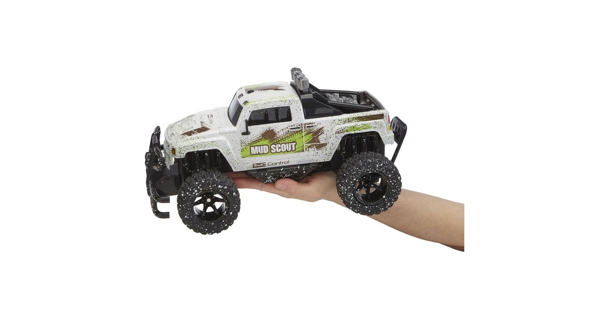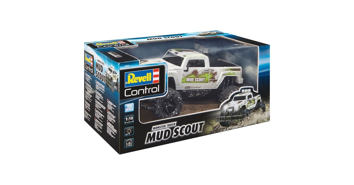Rauchende Reifen quietschen auf heißem Asphalt, beim NEW MUD SCOUT von Revell ist Action angesagt. Abseits der Straße schaufeln sich die mächtigen, profilierten Reifen durch unwegsames Gelände. Die hierfür nötige Power liefert der kraftvolle Antrieb und die handliche 2-Kanal-MHz-Fernsteuerung sorgt dafür, dass der 1:10er-Truck in jeder Situation beherrschbar bleibt.Art.-Nr.: 1437366