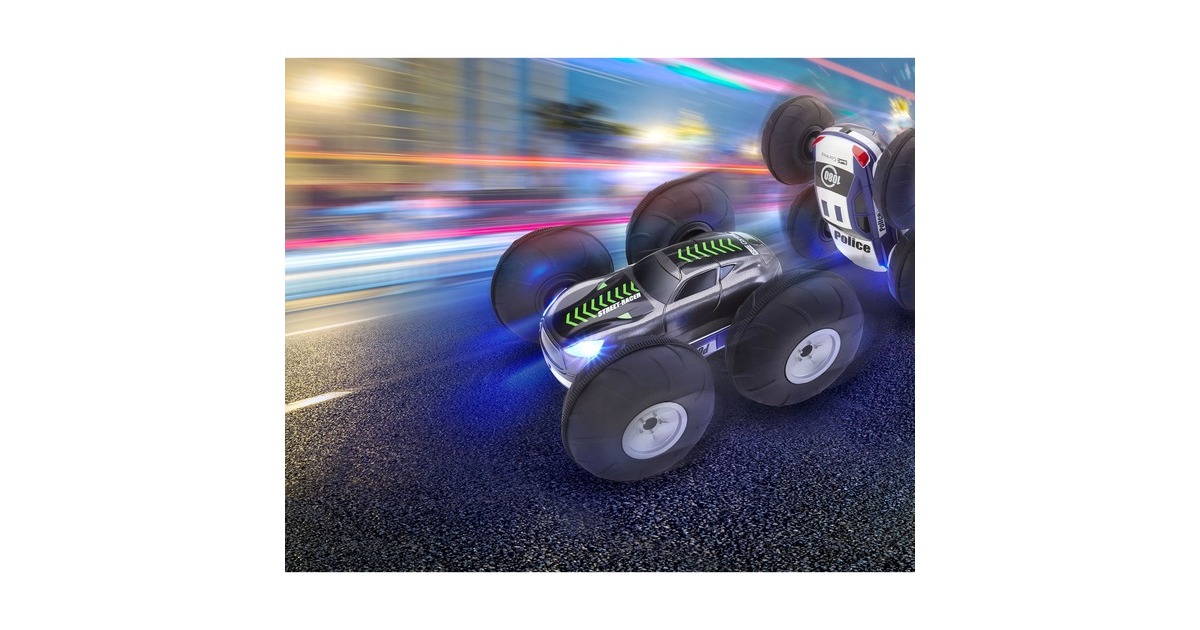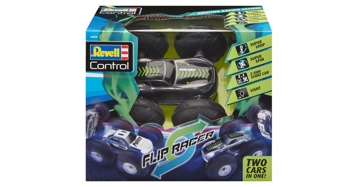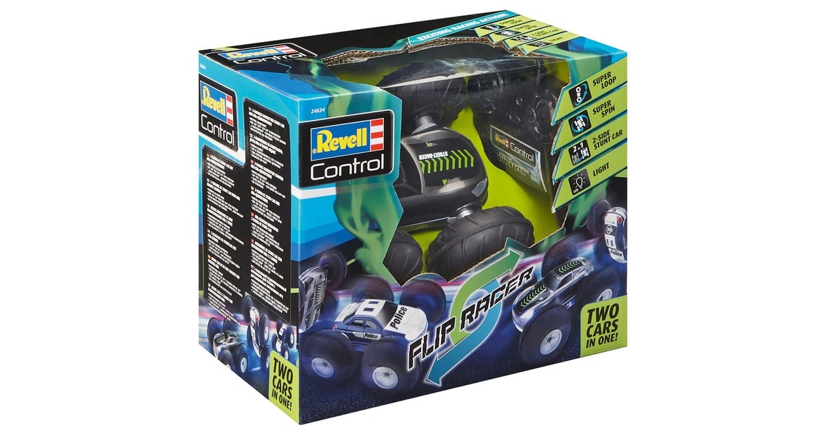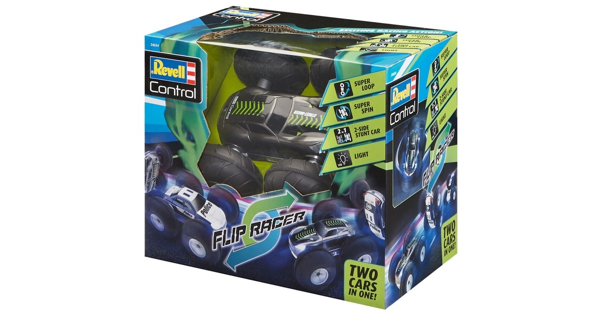 Das Revell Stunt Car FlipRacer vereint Jäger und Gejagter in einem Fahrzeug. Bei jedem Flip schlüpfst Du in die andere Rolle. Unterstützt durch große Ballonreifen, dem Einzelradantrieb und der LED Scheinwerfer lässt sich der FlipRacer auch im Dunkeln exakt steuern. Sofort einsatzbereit, keine lange Ladezeiten durch Einsatz von AAA-Batterien.Art.-Nr.: 1437341