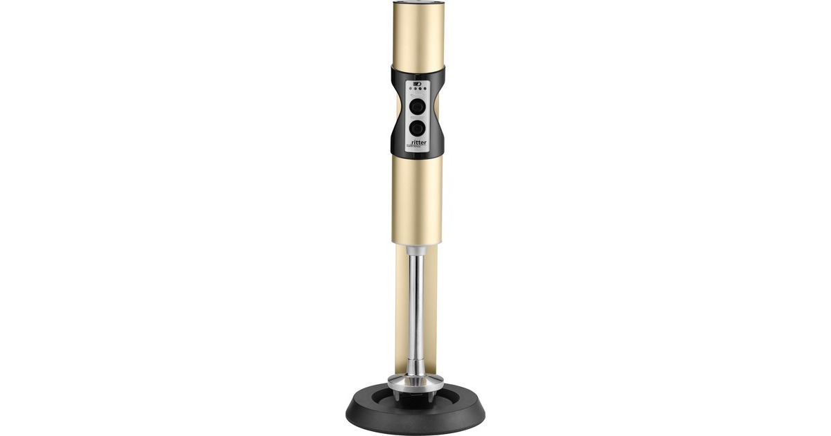 Der Stabmixer stilo7 in hellgold verfügt über eine hohe Materialqualität und besteht zum größten Teil aus stabilem Metall, während der Griff zugunsten angenehmer Ergonomie aus hochwertigem Kunststoff ist. Aufgrund des Akkubetriebs sorgt der kabellose Stabmixer für absolute Freiheit beim Kochen. Über eine LED-Anzeige kann der Ladestand des Akkus einfach abgelesen werden. Der Lithium-Ionen-Akku wird dank intelligenter Ladetechnik schonend und langsam aufgeladen ohne zu überladen. Der Ladevorgang endet automatisch, sobald der Akku voll ist. Diese Ladetechnik sorgt für eine lange Lebensdauer des Akkus. Auch das Thema Sicherheit kommt beim Stabmixer stilo7 nicht zu kurz: Er verfügt über ein Sicherheits-2-Finger-Einschaltsystem. Damit ein versehentliches Anschalten verhindert wird, müssen Entsperr- und Einschalttaste gleichzeitig betätigt werden. Der Stabmixer läuft mit maximaler Drehzahl von ca. 12.000 Umdrehungen pro Minute an. Mithilfe des Durchschaltsystems können dann zwei weitere niedrigere Drehzahlstufen ausgewählt werden. Als Schutz vor Überlastung schaltet das Gerät beispielsweise bei Blockade des Messers oder Überhitzung automatisch ab. Mit dem Universalmesser lassen sich die meisten Lebensmittel Pürieren. Der Kunststoff-Mixbecher ist durch seine schmale, hohe Form optimal für die Verarbeitung geeignet.Art.-Nr.: 1834783