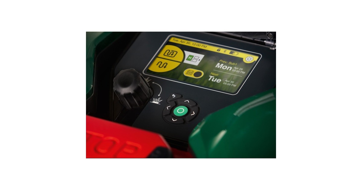 Per Touchscreen oder per App über Bluetooth: -Mähvorgang beginnen, -Zur Ladestation zurückkehren, -Mähplan festlegen, -Mehrere Mähzonen verwalten, -Modus "Manuell", -Fernsteuerung | Benachrichtigungen: -Ladestatus, -Startzeiten, -Warnmeldungen zu Betrieb und Sicherheit, -Optionale Sicherheitswarnmeldung 5 Minuten vor dem automatischen Start. |