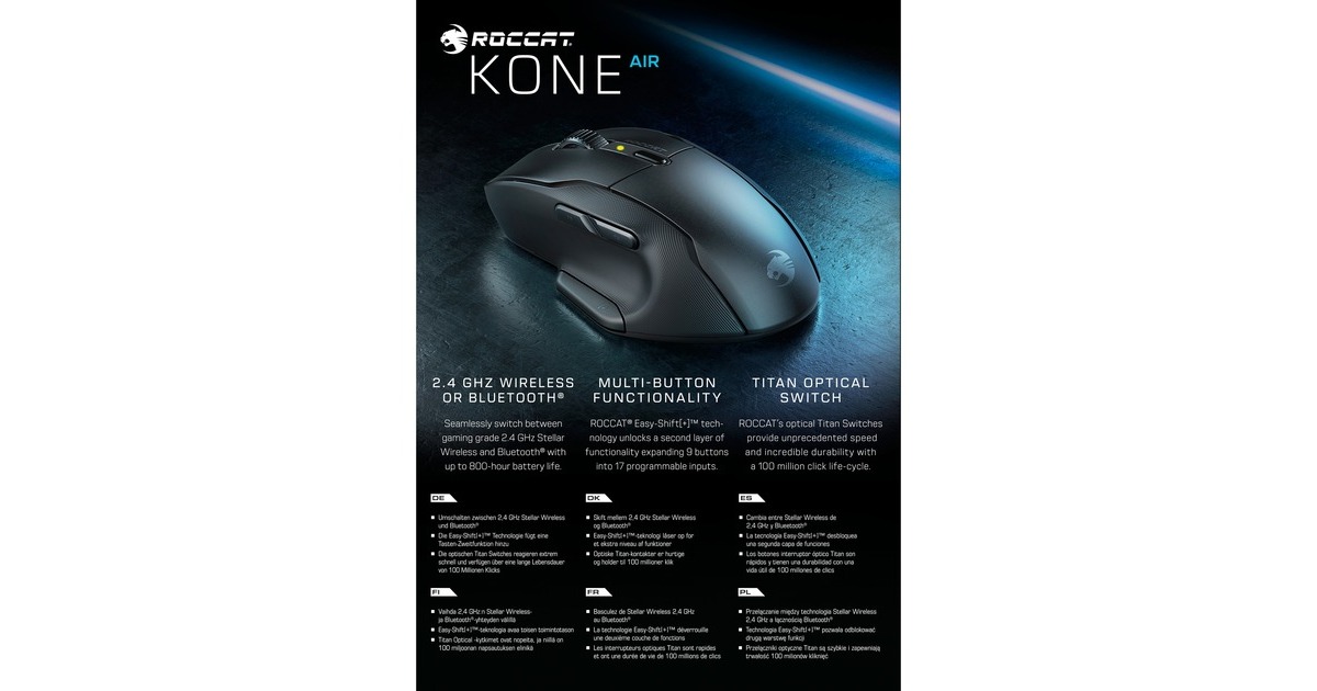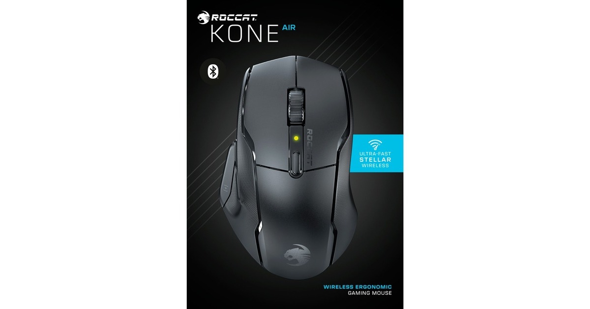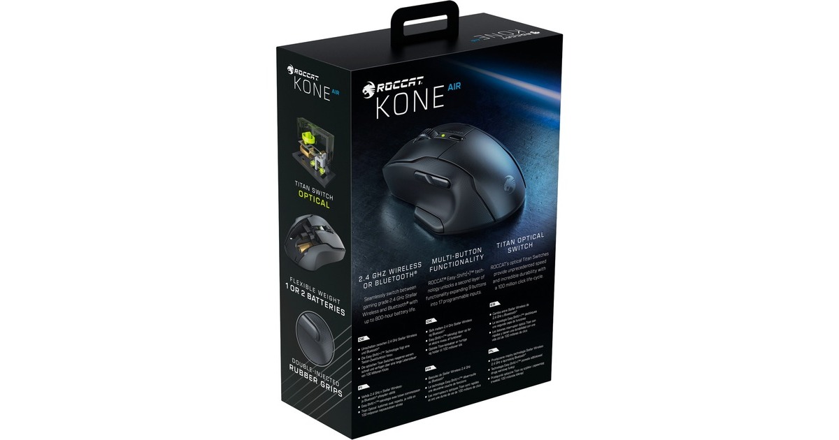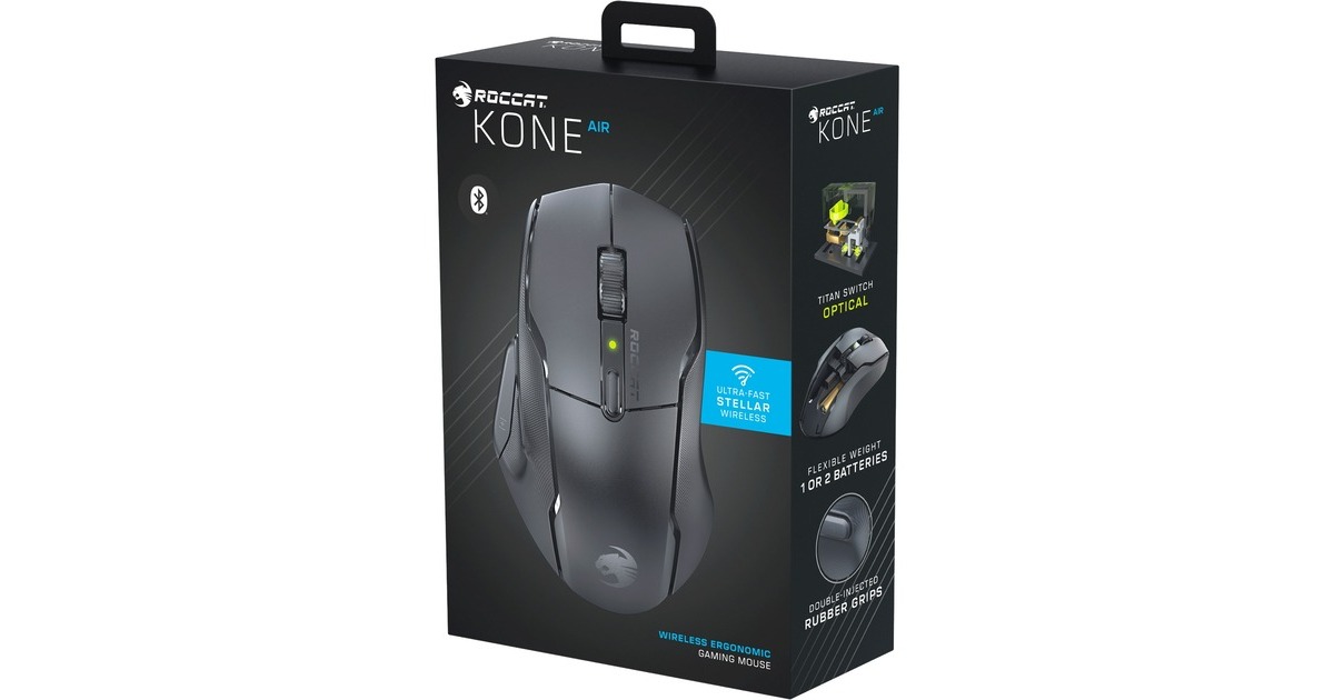 Die kabellose, ergonomisch gestaltete Gaming-Maus Kone Air von Roccat bietet Gamern maximale Flexibilität - für die Arbeit und Gaming. Die Stellar Wireless-Verbindung mit 2,4 GHz gewährleistet ein verzögerungsfreies Gaming-Erlebnis. Der Bluetooth-Modus ermöglicht Produktivität bei geringerem Energieverbrauch für unterwegs. Ein oder zwei AA-Batterien sorgen für eine Akkulaufzeit von bis zu 800 Stunden. Die ergonomische Kone-Form bietet Bedienkomfort auch bei intensiven Gaming-Sessions. Durch ausreichend Platz für die Handfläche und strapazierfähige, doppelschichtige Kautschuk-Seitengriffe ist das Bediengefühl der Kone Air unverwechselbar. Das Multi-Tasten-Design wird durch die Easy-Shift[+] Tasten-Duplikationstechnologie erweitert, die für insgesamt 9 Tasten 17 programmierbare Eingabemöglichkeiten eröffnet: Einfach die programmierbare Easy-Shift[+]-Taste gedrückt halten - schon eröffnet sich eine breite Palette an Zweitfunktionen. Roccats Titan Tasten-Switches ermöglichen in Kombination mit dem Owl-Eye Optical-Sensor mit 19.000 DPI höchstes Niveau an Geschwindigkeit, Präzision und Reaktionsschnelligkeit. Art.-Nr.: 1907800