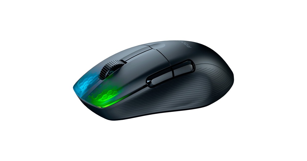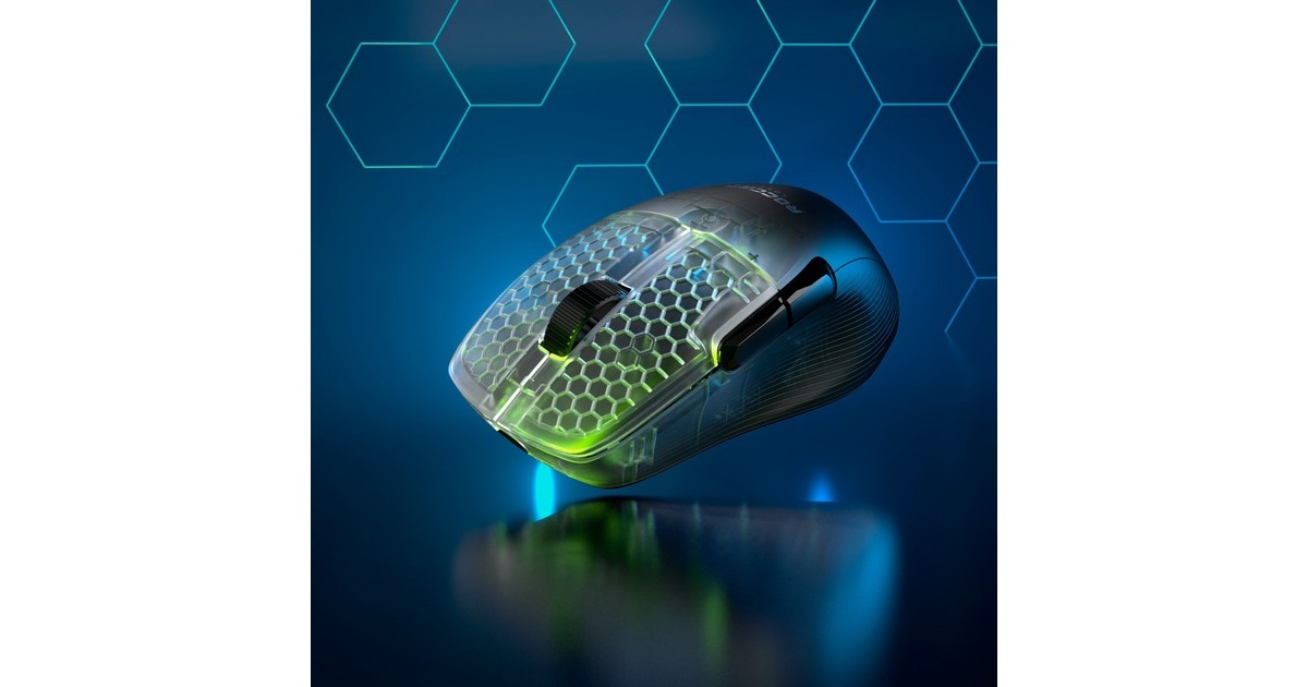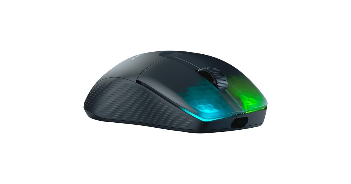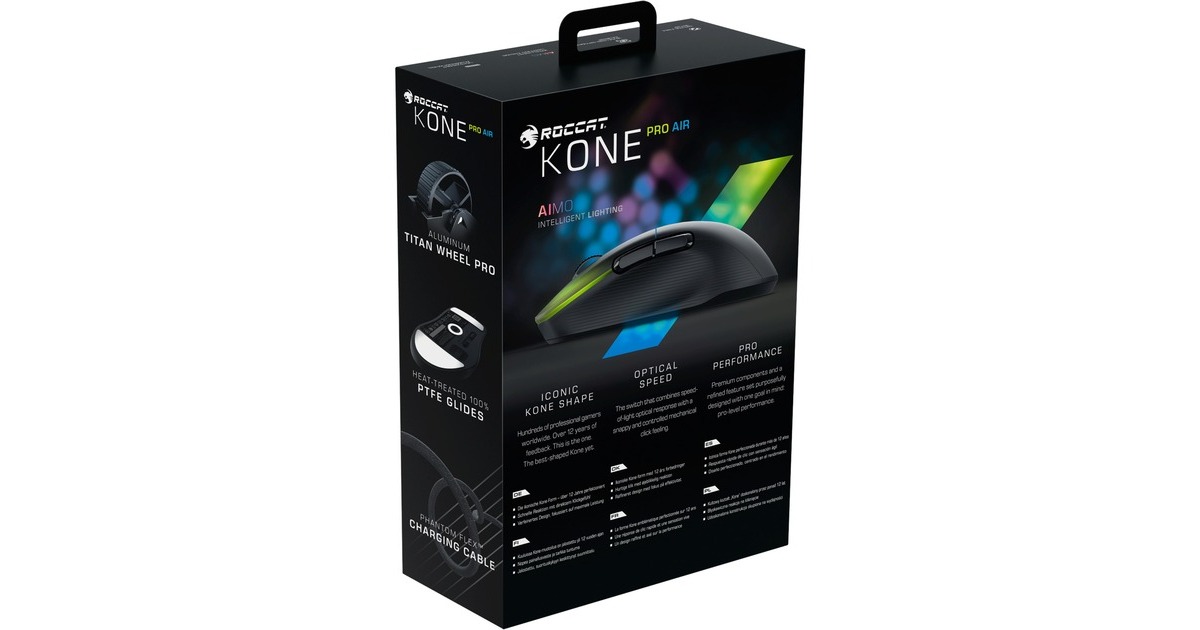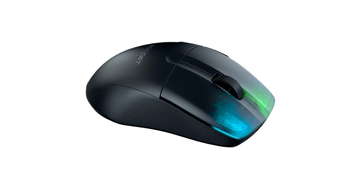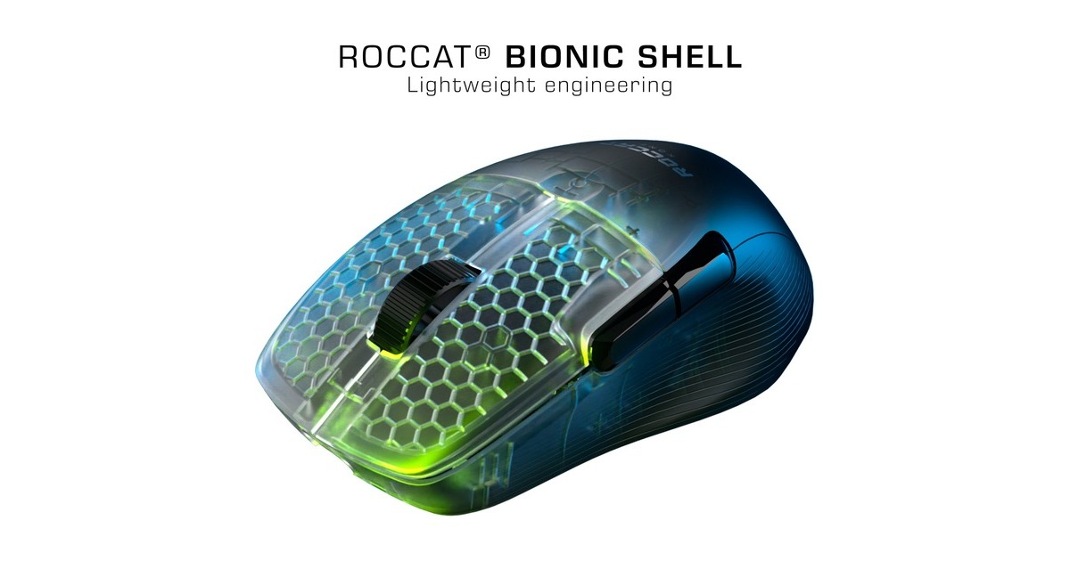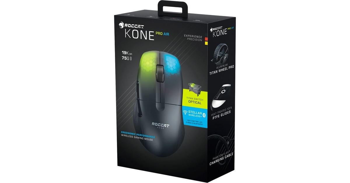Perfektionierte Ergonomie in charakteristischem Shape | Extrem leichtes, transluzentes Roccat Bionic Shell (75 g) | Stellar Wireless + Bluetooth für über 100 Stunden Akku-Power plus Rapid Charge Schnelladefunktion | Titan Wheel Pro | Einstellbare Lift-off-Distanz | Integrierter Speicher | Roccat AIMO |