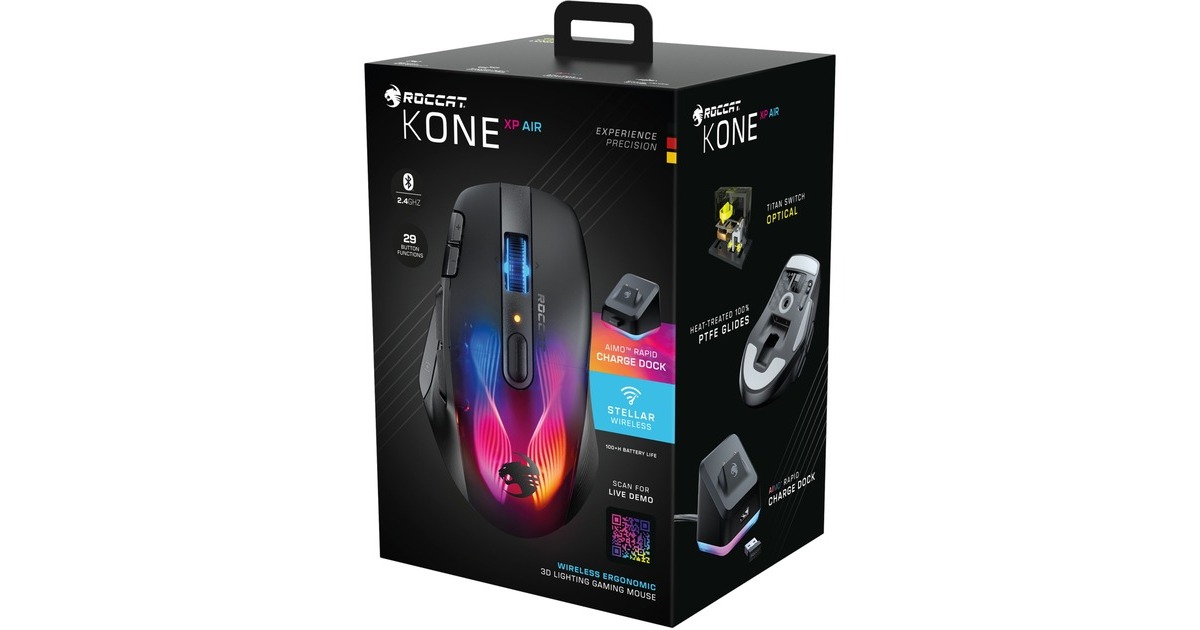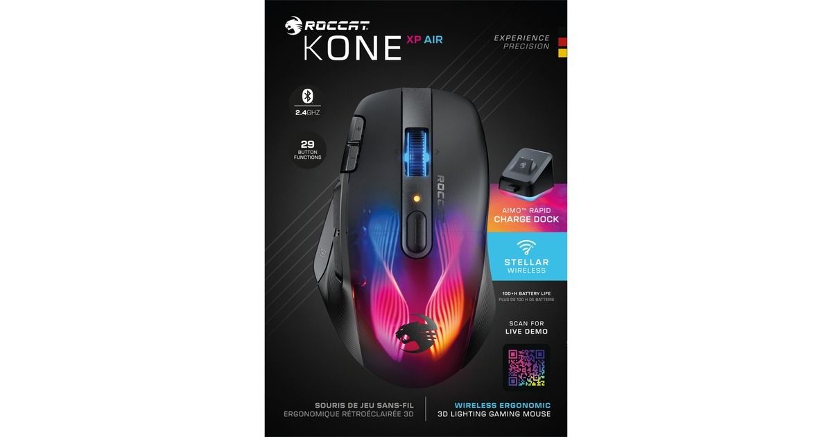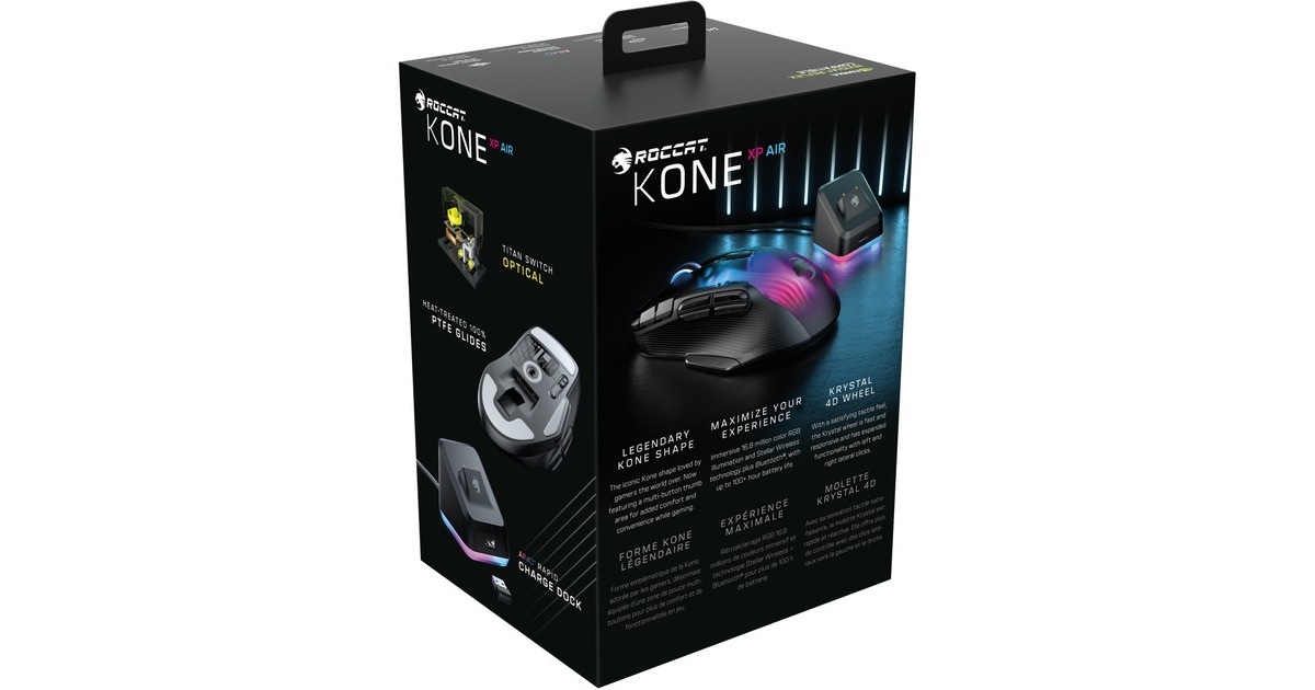 Die Roccat Kone XP Air mit 3D-Beleuchtung ist eine kabellose Gaming-Maus mit der hervorragenden Ergonomie des legendären, jetzt noch weiter verfeinerten Kone-Designs. Ihr durchscheinende Gehäuse bietet ein Lichtspektakel aus 22 LEDs und acht Lightguides, was eine noch nie dagewesene Tiefe und Immersion erzeugt. Sie verfügt über 10 Tasten, die mithilfe der Roccat Easy-Shift[+]-Technologie doppelt belegt werden können, was 29 Tastenfunktionen ermöglicht. Ideal für MMO- und Echtzeitstrategie-Spieler, die schnellen Zugriff auf verschiedenste Eingabebefehle benötigen, oder Gamer, die sich maximale Anpassungsfähigkeit wünschen. Das Krystal 4D-Mausrad der Kone XP Air lässt sich nach links und rechts kippen und schafft so zusätzlich zur Standardfunktionalität des vertikalen Klickens und Scrollens weitere Eingabemöglichkeiten – und das alles mit einem unverwechselbaren taktilen Bediengefühl. Aus durchscheinendem Material hergestellt, setzt das Krystal 4D-Mausrad die RGB-Beleuchtung zudem auf besondere Weise in Szene. Der Roccat Titan Optical Schalter ist schnell, robust und zuverlässig und bietet ein angenehm taktiles Klickgefühl. Keine Probleme beim Doppelklicken und keinerlei Eingewöhnungszeit. Weiterhin kommt bei der Kone XP Air der hochmoderne optische Owl-Eye-Sensor mit 19.000 dpi zum Einsatz, der mit hoher Reaktionsfähigkeit und Präzision brilliert. Man kann einfach zwischen der für Gaming optimierten 2,4-GHz-Stellar-Wireless-Verbindung und Bluetooth für maximale Vielseitigkeit wechseln und die ganze Nacht mit mehr als 100 Akkulaufzeit in einer vollständigen Aufladung spielen. Die stylishe Schnellladestation ermöglicht fünf Stunden Spielzeit nach nur 10 Minuten Aufladen. Mit vier RGB-Beleuchtungszonen akzentuiert die Ladestation jede Desktop-Einrichtung. Außerdem lässt sich der 2,4-GHz-Empfänger mit dem USB-Passthrough-Anschluss an der Vorderseite verbinden.Art.-Nr.: 1859144