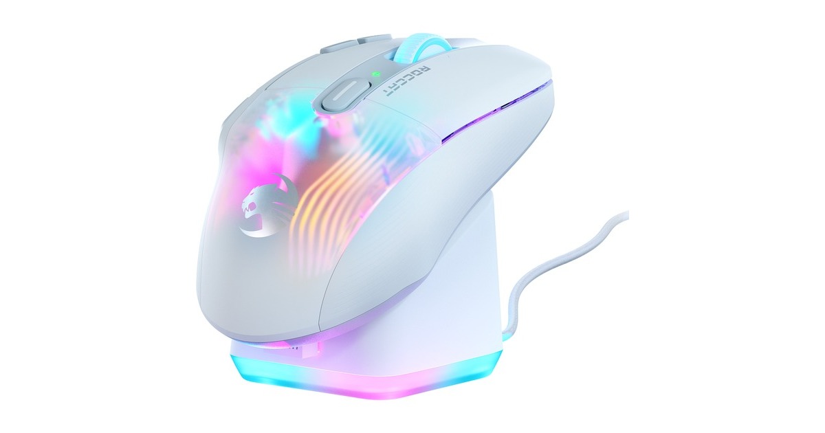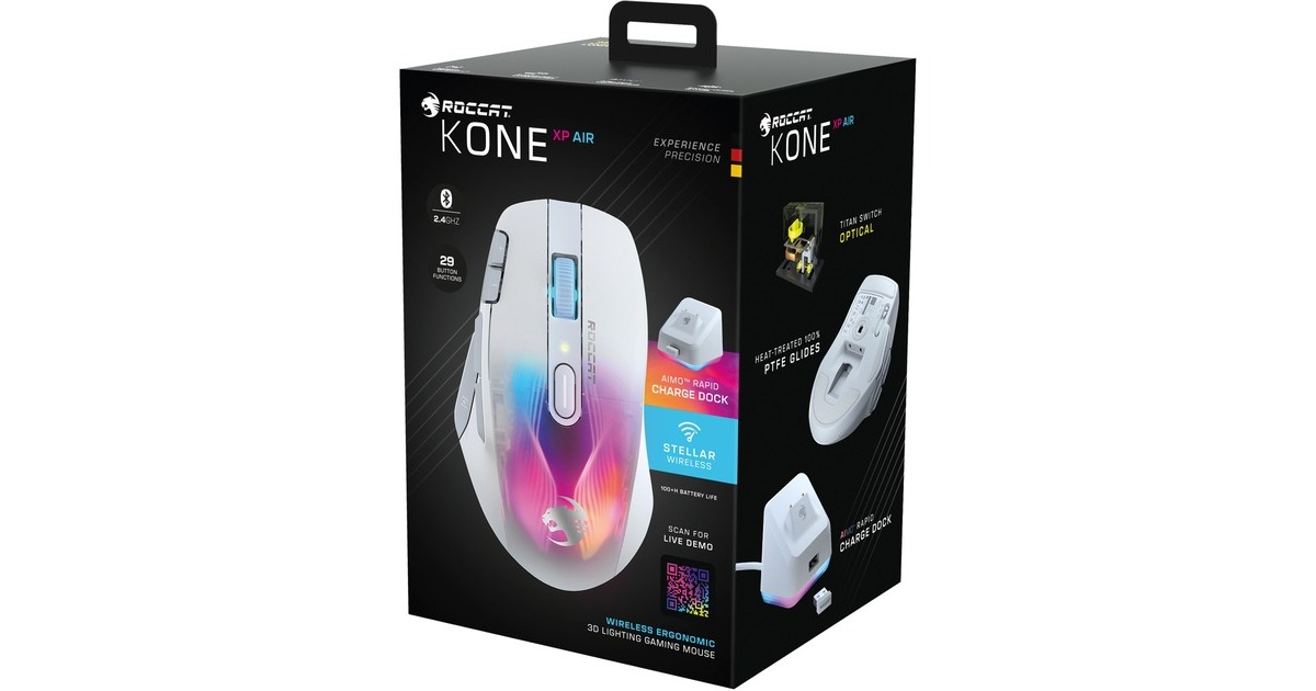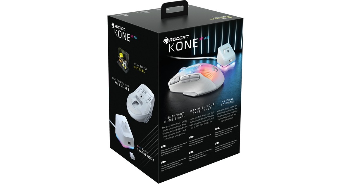 Die Roccat Kone XP Air mit 3D-Beleuchtung ist eine kabellose Gaming-Maus mit der hervorragenden Ergonomie des legendären, jetzt noch weiter verfeinerten Kone-Designs. Ihr durchscheinende Gehäuse bietet ein Lichtspektakel aus 22 LEDs und acht Lightguides, was eine noch nie dagewesene Tiefe und Immersion erzeugt. Sie verfügt über 10 Tasten, die mithilfe der Roccat Easy-Shift[+]-Technologie doppelt belegt werden können, was 29 Tastenfunktionen ermöglicht. Ideal für MMO- und Echtzeitstrategie-Spieler, die schnellen Zugriff auf verschiedenste Eingabebefehle benötigen, oder Gamer, die sich maximale Anpassungsfähigkeit wünschen. Das Krystal 4D-Mausrad der Kone XP Air lässt sich nach links und rechts kippen und schafft so zusätzlich zur Standardfunktionalität des vertikalen Klickens und Scrollens weitere Eingabemöglichkeiten – und das alles mit einem unverwechselbaren taktilen Bediengefühl. Aus durchscheinendem Material hergestellt, setzt das Krystal 4D-Mausrad die RGB-Beleuchtung zudem auf besondere Weise in Szene. Der Roccat Titan Optical Schalter ist schnell, robust und zuverlässig und bietet ein angenehm taktiles Klickgefühl. Keine Probleme beim Doppelklicken und keinerlei Eingewöhnungszeit. Weiterhin kommt bei der Kone XP Air der hochmoderne optische Owl-Eye-Sensor mit 19.000 dpi zum Einsatz, der mit hoher Reaktionsfähigkeit und Präzision brilliert. Man kann einfach zwischen der für Gaming optimierten 2,4-GHz-Stellar-Wireless-Verbindung und Bluetooth für maximale Vielseitigkeit wechseln und die ganze Nacht mit mehr als 100 Akkulaufzeit in einer vollständigen Aufladung spielen. Die stylishe Schnellladestation ermöglicht fünf Stunden Spielzeit nach nur 10 Minuten Aufladen. Mit vier RGB-Beleuchtungszonen akzentuiert die Ladestation jede Desktop-Einrichtung. Außerdem lässt sich der 2,4-GHz-Empfänger mit dem USB-Passthrough-Anschluss an der Vorderseite verbinden.Art.-Nr.: 1859145