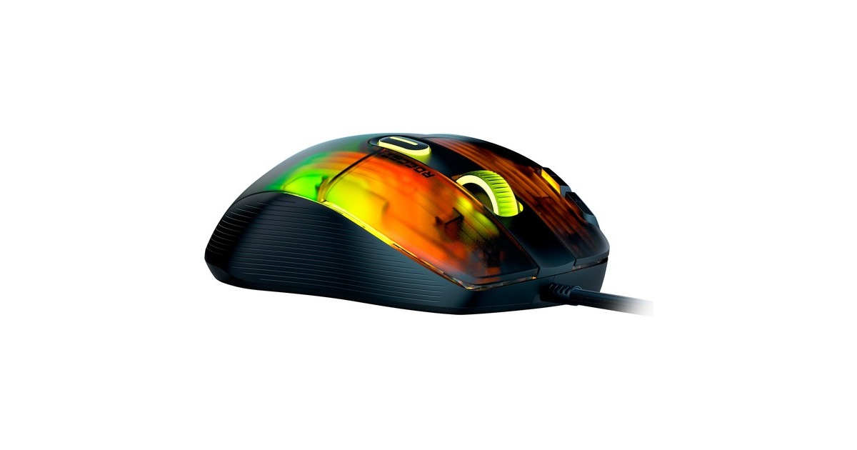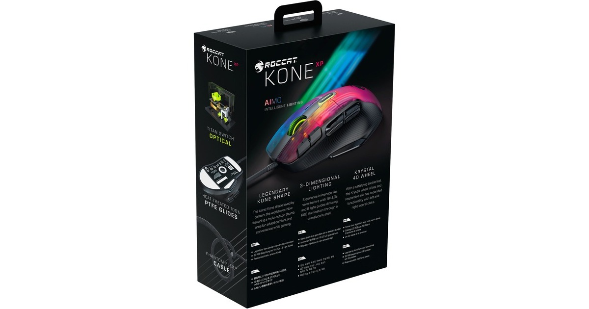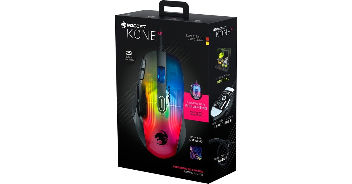 Die Kone XP mit 3D-Beleuchtung ist die neueste Gaming-Maus von Roccat mit der hervorragenden Ergonomie des legendären, jetzt noch weiter verfeinerten Kone-Designs. Als geistiger Nachfolger der außerordentlich beliebten Kone AIMO Remastered wurde die Kone XP in jeder Hinsicht verbessert. Das durchscheinende Gehäuse der Kone XP bietet ein Lichtspektakel aus 22 LEDs und acht Lightguides, was eine noch nie dagewesene Tiefe und Immersion erzeugt. Sie verfügt über 15 Tasten, die mithilfe der Roccat Easy-Shift[+]-Technologie doppelt belegt werden können, was 29 Tastenfunktionen ermöglicht. Ideal für MMO- und Echtzeitstrategie-Spieler, die schnellen Zugriff auf verschiedenste Eingabebefehle benötigen, oder Gamer, die sich maximale Anpassungsfähigkeit wünschen. Das Krystal 4D-Mausrad der Kone XP lässt sich nach links und rechts kippen und schafft so zusätzlich zur Standardfunktionalität des vertikalen Klickens und Scrollens weitere Eingabemöglichkeiten – und das alles mit einem unverwechselbaren taktilen Bediengefühl. Aus durchscheinendem Material hergestellt, setzt das Krystal 4D-Mausrad die RGB-Beleuchtung zudem auf besondere Weise in Szene. Der Roccat Titan Optical Schalter ist schnell, robust und zuverlässig und bietet ein angenehm taktiles Klickgefühl. Keine Probleme beim Doppelklicken und keinerlei Eingewöhnungszeit. Weiterhin kommt bei der Kone XP der hochmoderne optische Owl-Eye-Sensor mit 19.000 dpi zum Einsatz, der mit hoher Reaktionsfähigkeit und Präzision brilliert. Das Roccat PhantomFlex-Kabel bietet eine fast kabellose Spielerfahrung ohne Reibungswiderstand oder Verheddern. Die Basis dafür sind die hitzehandelten Premium-Mausfüße aus reinem PTFE, deren grandiose Gleiteigenschaften von Anfang an begeistern.Art.-Nr.: 1821734