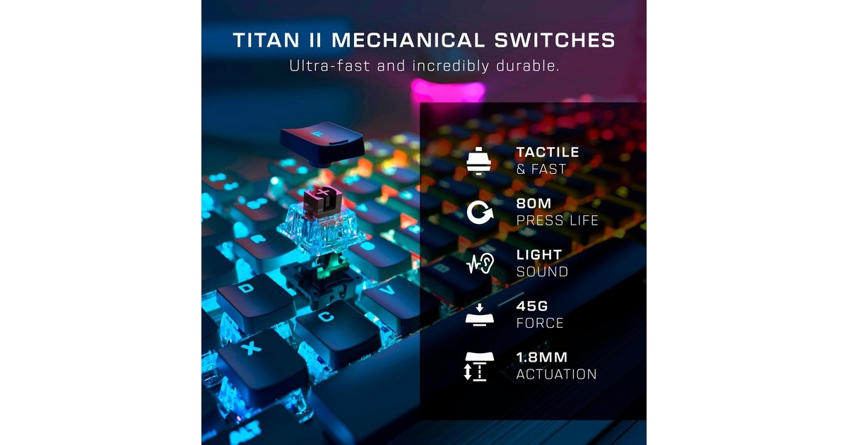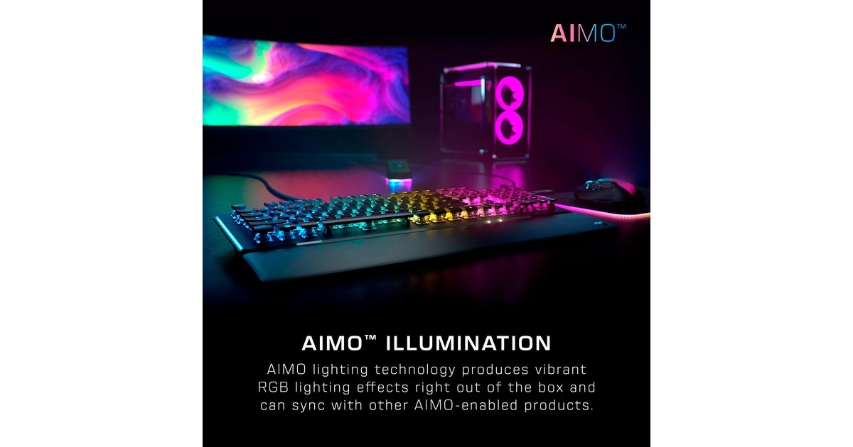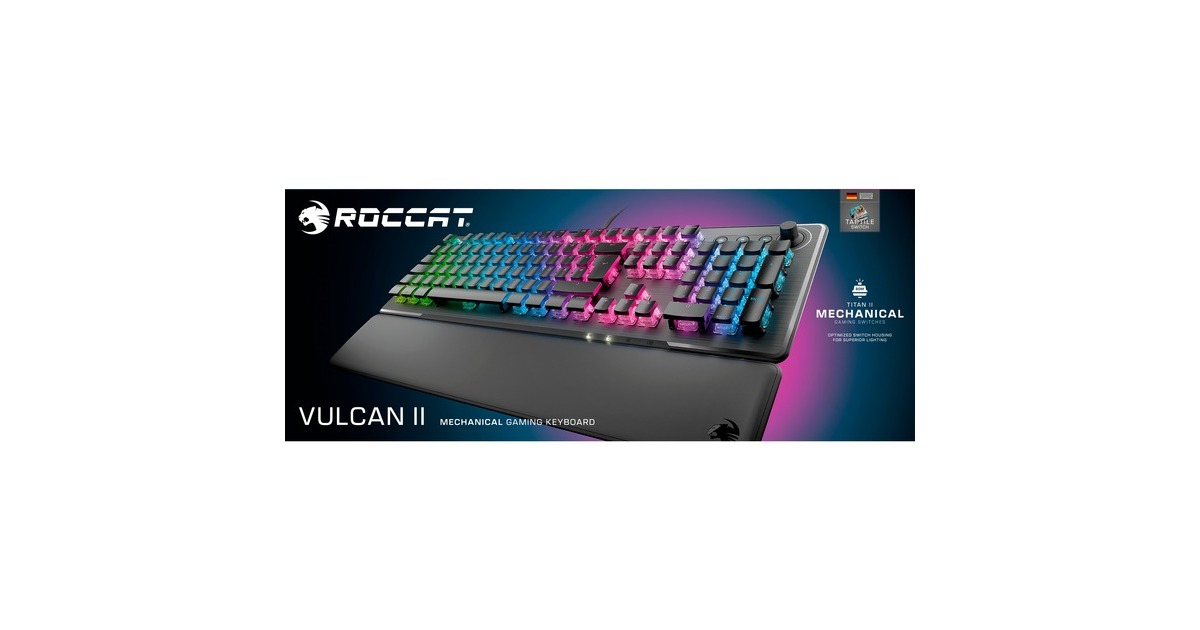 Die Vulcan II baut auf dem Erfolg der preisgekrönten Roccat Vulcan Serie auf und setzt mit den mechanischen Roccat Titan II Schaltern einen neuen Standard in Sachen Gaming-Performance. Die Roccat Titan II Schalter wurden mit einem transparenten Gehäuse für ein beeindruckendes Beleuchtungserlebnis, einer verlängerten Lebensdauer von mehr als 80 Millionen Anschlägen und Cross Stems für die Kompatibilität mit Tastenkappen von Drittanbietern zum Anpassen des Looks optimiert. Für einen zusätzlichen Funktionsvorteil kann man im Spielmodus auf die Easy-Shift[+]-Funktionsebene zugreifen und eine zweite Funktionsebene freischalten, die mit nahezu unbegrenzten Optionen programmiert werden kann. Die Vulcan II verfügt über einen kompletten Satz von Medientasten und einen Lautstärkeregler mit Stummschaltung, mit dem sich Medien steuern lassen, ohne das Spiel zu unterbrechen. Außerdem sorgen vollständiges n-Key-Rollover und Anti-Ghosting dafür, dass jeder einzelne Tastendruck und jede Tastenkombination immer wie vorgesehen registriert werden. Die Vulcan II verfügt zudem über einzigartige ikonische Elemente, wie flache Tastenkappen, die abnehmbare gepolsterte Handballenauflage, die robuste Aluminiumrückwand und die AIMO-Beleuchtungstechnologie, die sofort nach dem Auspacken leuchtende RGB-Lichteffekte erzeugt und mit anderen kompatiblen AIMO-fähigen Produkten synchronisiert werden kann. Bis zu vier Profile lassen sich mit benutzerdefinierter Beleuchtung, Tastenbelegung und mehr direkt auf der Tastatur speichern.Art.-Nr.: 100002763