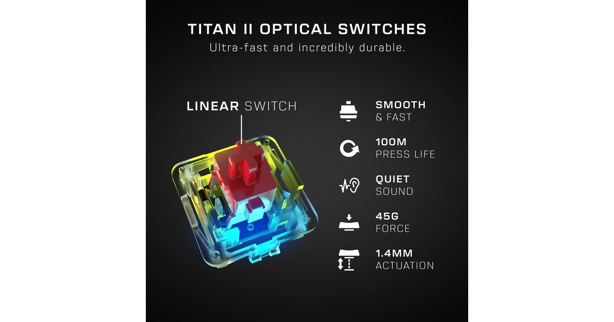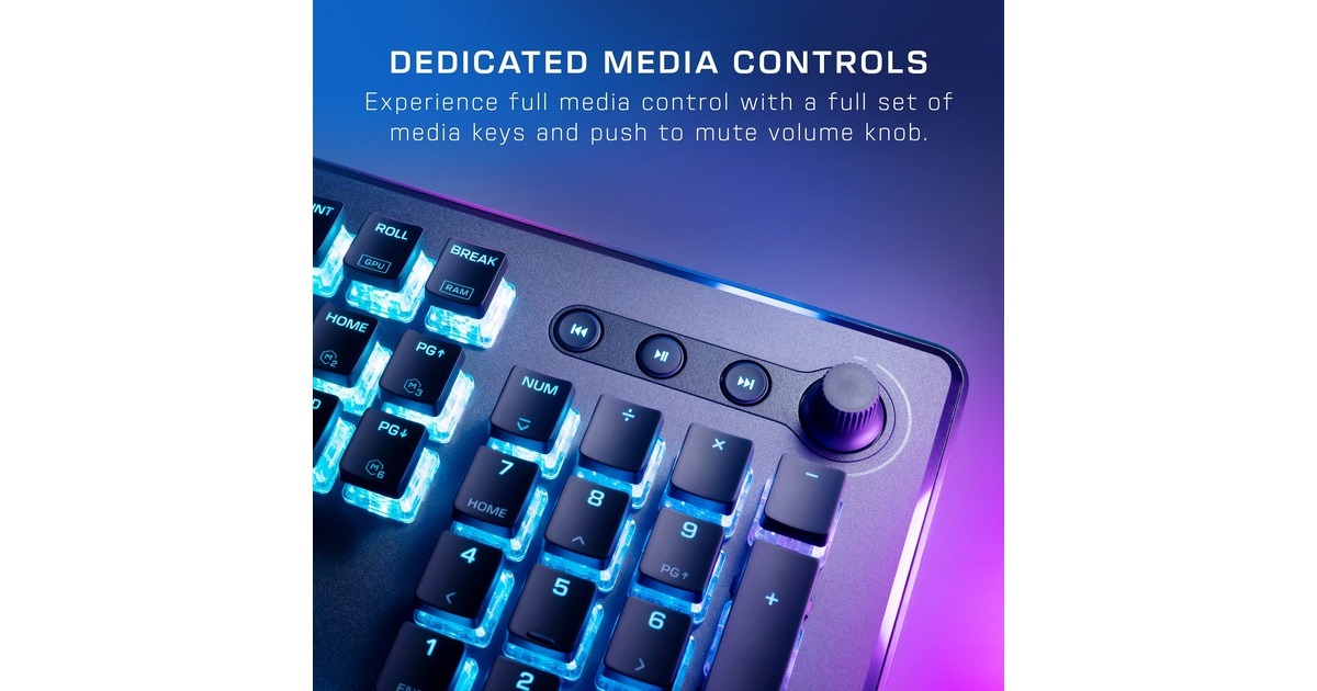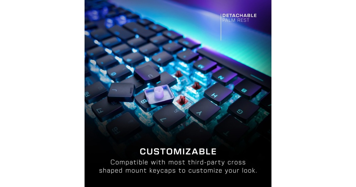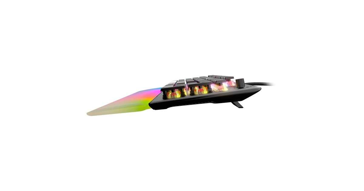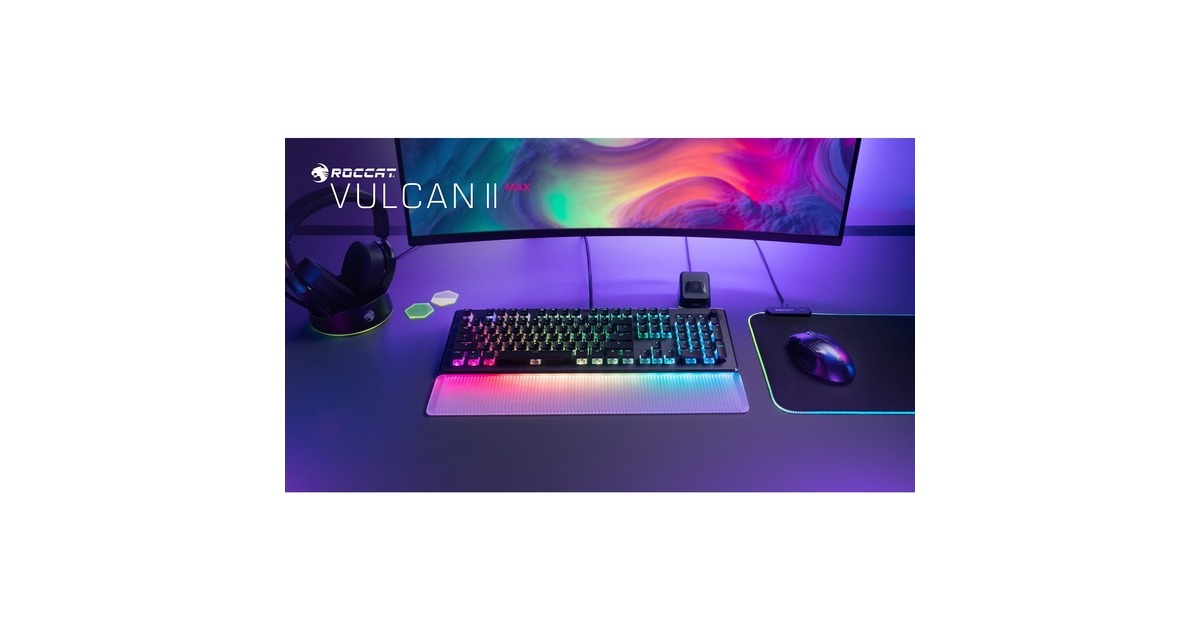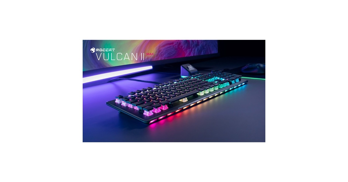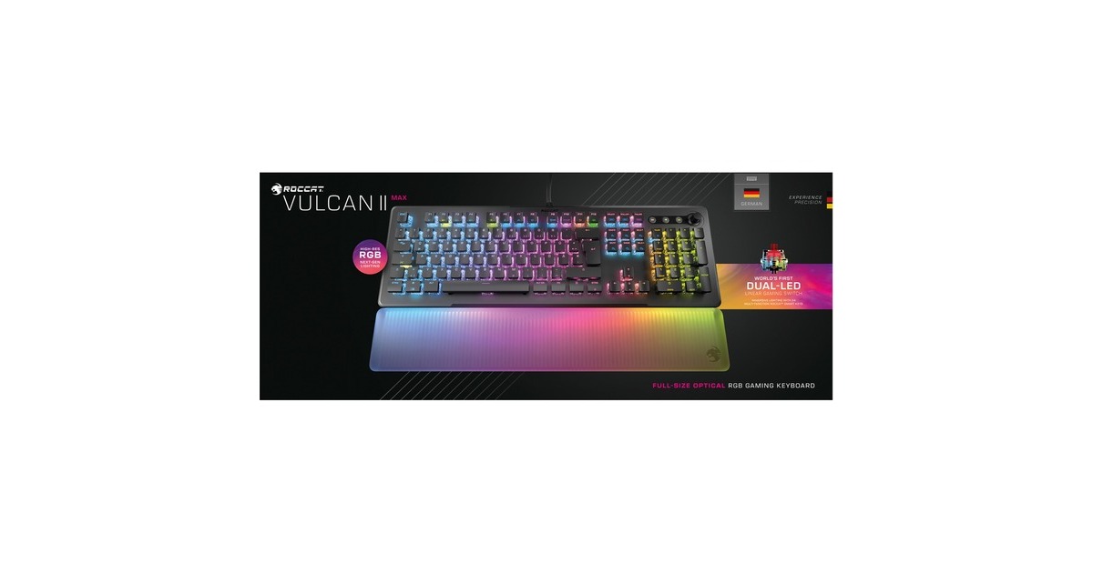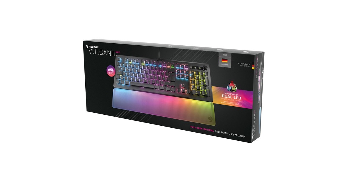 Die optisch-mechanische Roccat Vulcan II Max Gaming-Tastatur kombiniert Strapazierfähigkeit, Performance und Funktionalität in einem spektakulären, RGB-beleuchteten Design. Die exklusiven Roccat Titan II Optical Switches erzeugen ein reibungsloses mechanisches Tastendruckgefühl und bieten eine extrem schnelle Tastenauslösung sowie unglaubliche Strapazierfähigkeit dank einer Lebensdauer von 100 Millionen Klicks, um bei jedem Spiel Gaming auf Wettkampfniveau zu ermöglichen. Sie sind zudem kompatibel mit vielen Drittanbieter-Tastenkappen mit kreuzförmigem Befestigungsaufsatz, damit man den Look der Vulcan II Max ganz individuell anpassen kann. Im Spielmodus hat du Zugriff auf die Easy-Shift [+] Tasten-Duplikationstechnologie, die jeder Taste eine Zweitfunktion zuordnet und sich programmieren lässt für nahezu unendliche Kombinationsmöglichkeiten. Man kann jeden Tastendruck mit absoluter Präzision ausführen durch die 24 multifunktionalen Smart-Tasten mit jeweils eigener LED, die anzeigt, wenn eine Zweitfunktion aktiv ist. Auch das Mitführen unterwegs ist kein Problem, da bis zu vier benutzerdefinierte Profile für Beleuchtung, Tastenzuweisungen und mehr direkt auf der Tastatur gespeichert werden können. Die Vulcan II Max ist darüber hinaus ausgestattet mit den beliebtesten Eigenschaften wie einer eloxierten Aluminium-Abdeckplatte, die für dauerhafte strukturelle Integrität sorgt, sowie dedizierten Multimedia-Bedienelementen, damit man das Spiel niemals unterbrechen muss. Die weiche, durchsichtige Handballenauflage bildet das Fundament für Roccats AIMO-Beleuchtungstechnologie, die ein dynamisches RGB-Lichtspektakel erzeugt und sich auch mit anderen kompatiblen AIMO-fähigen Produkten für ein immersives Beleuchtungserlebnis synchronisieren lässt.Art.-Nr.: 100010146