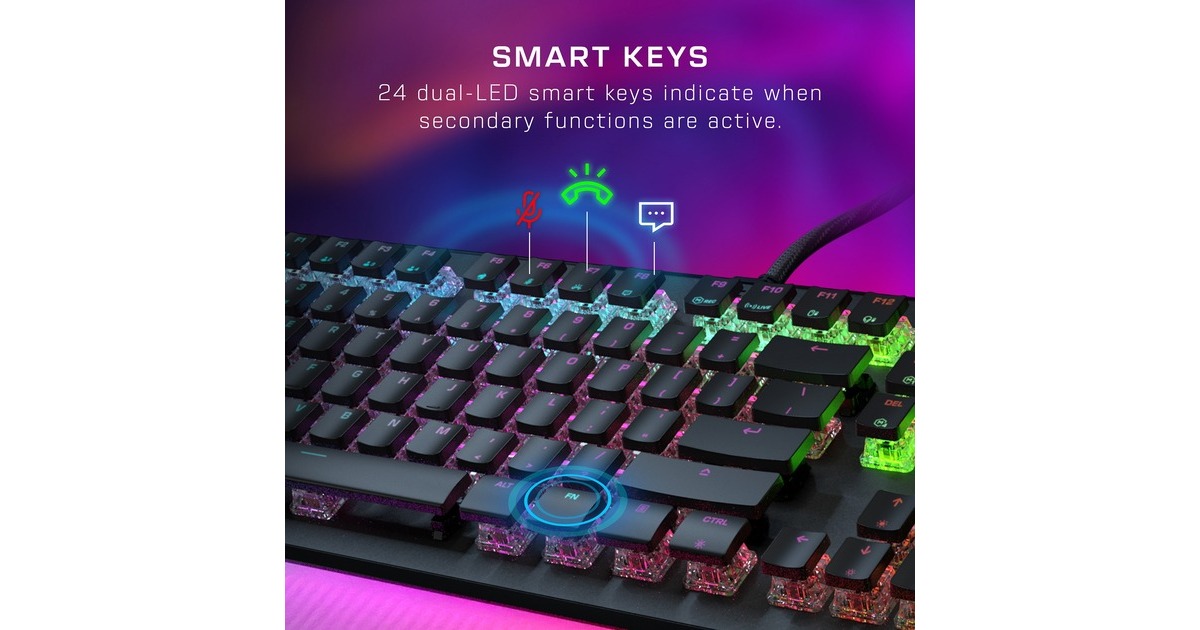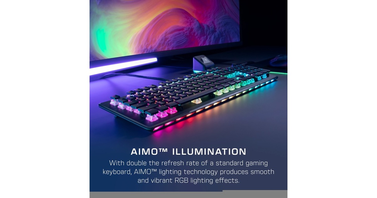 24 multifunktionale Smart-Tasten mit dedizierten LEDs für Zweitfunktion-Anzeige, Easy-Shift [+] Tasten-Duplikationstechnologie, Lautstärke-Regler mit Stummschaltungsfunktion, Aluminium-Abdeckplatte, 4 Onboard-Profile, vollständig beleuchtete Handballenauflage, AIMO-RGB-Beleuchtung |