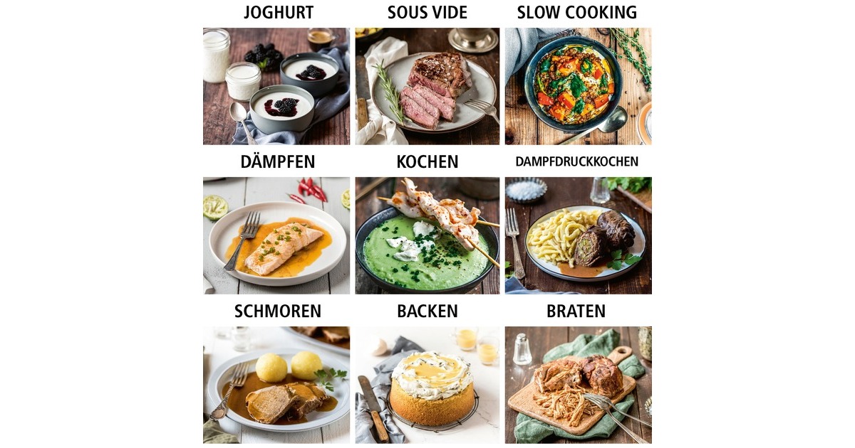 (An-) Braten, Backen, Dampfgaren, Kochen, Niedrigtemperatur-Garen, Schmoren, Sous-Vide-Garen |