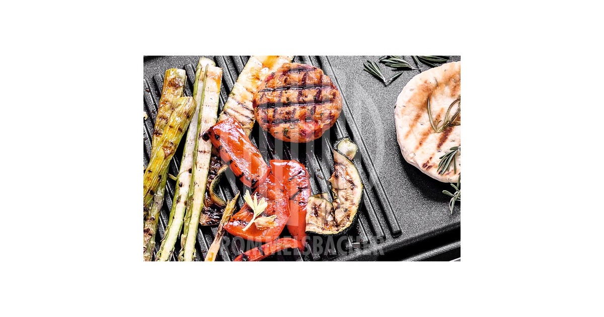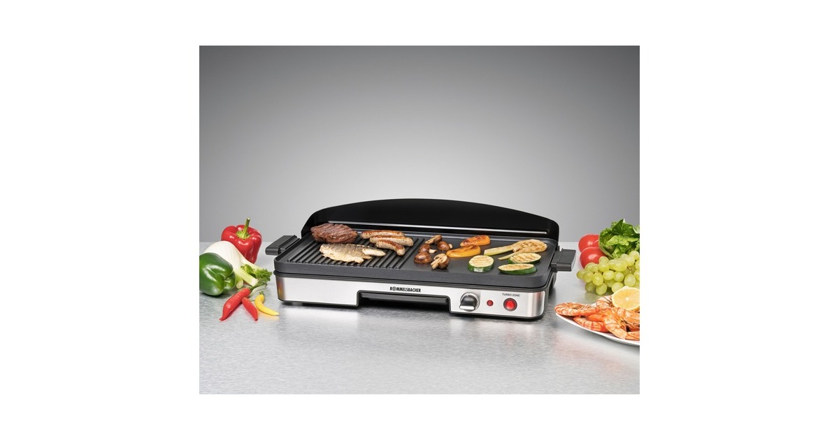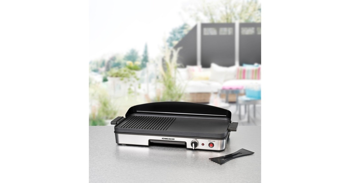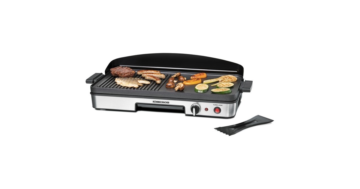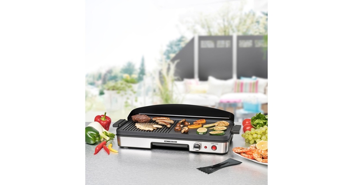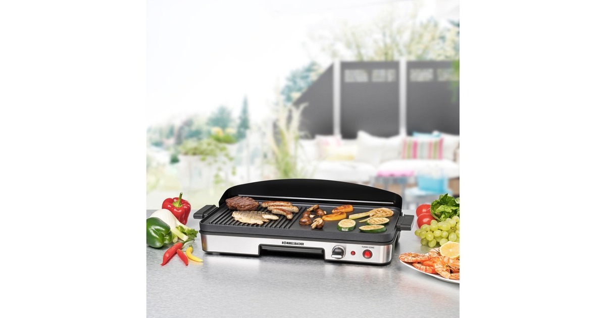 Der Tischgrill BBQ 2003 mit hochwertiger Edelstahl Front kann im Freien, auf Balkon und Terrasse oder im Innenbereich, bei Tisch und in der Küche eingesetzt werden. Er sorgt für ein sicheres und komfortables Grillvergnügen, ganz ohne Rauch und Feuer. Grillen mit Strom bedeutet schnelles Aufheizen bei präziser Temperaturregelung. Das lästige Entsorgen von Asche- oder Kohleresten entfällt. Die Grillplatte aus stabilem Alu-Druckguss mit sehr robuster Antihaftbeschichtung ist in zwei Zonen aufgeteilt. Auf der geriffelten Fläche erhalten Fleisch und Gemüse das typische Grillmuster, auf der glatten Teppanyaki Fläche lassen sich Fisch, Gemüse, aber auch Pfannkuchen und Süßspeisen zubereiten. Die Heizelemente sind direkt in die Grillplatten eingearbeitet, dadurch wird eine optimale Temperaturverteilung erreicht. Die Regelung der Temperatur ist stufenlos über den Drehregler möglich. Zusätzlich hat der Tischgrill BBQ 2003 eine zuschaltbare Turbo-Grillzone für schnelles, scharfes Anbraten. Der integrierte Fettablauf, die entnehmbare Auffangschale, die wärmeisolierten Handgriffe, der abnehmbare Spritz-/Windschutz und die superleichte Reinigung sorgen für den sehr guten Bedienkomfort des BBQ 2003.Art.-Nr.: 1518361