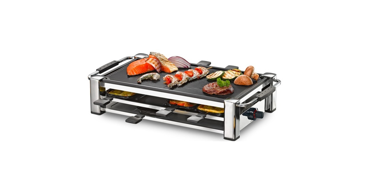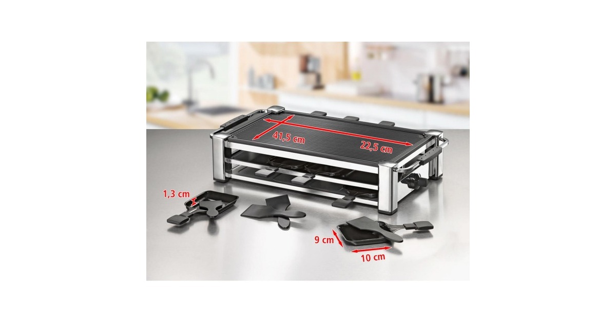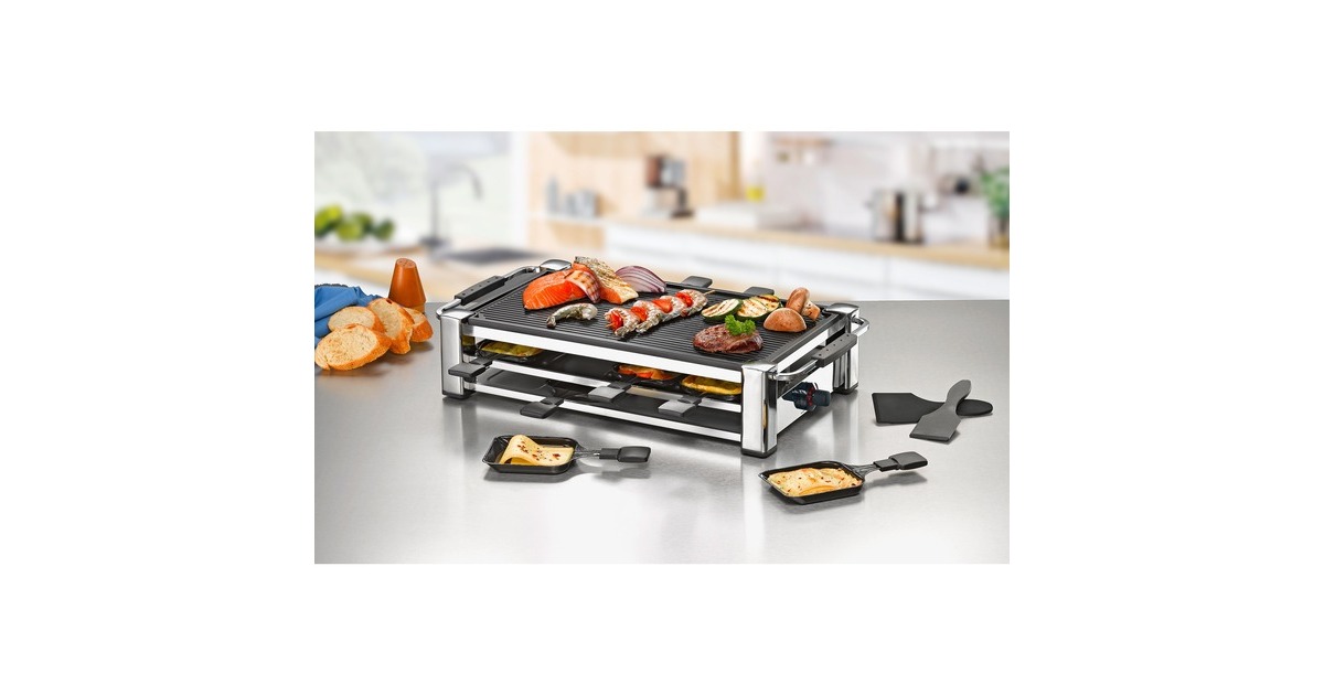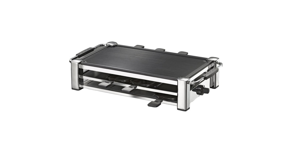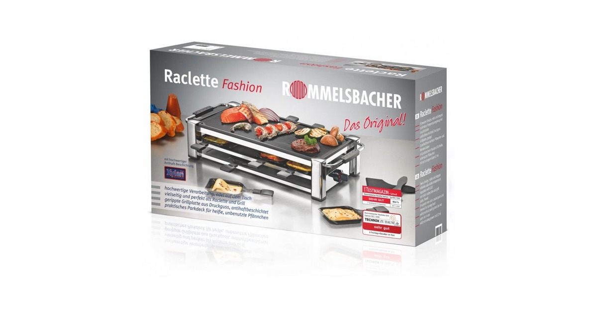 Das Rommelsbacher Gourmet Raclette Fashion RCC 1500 im Schweizer Design besticht durch Eleganz und hochwertige Verarbeitung. Das verchromte Gehäuse steht stabil und sicher und ist ein Blickfang auf jedem Tisch. Auf der gerippten Grillplatte gelingt alles perfekt - ob Fleisch, Würstchen, Scampi, Fisch oder Gemüse. Gegrilltes erhält dabei die beliebten Grillstreifen. In den Pfännchen kann man leckere Snacks überbacken und würzigen Raclette-Käse schmelzen. Die Temperatur des Grills kann mittels Thermostat nach Belieben stufenlos geregelt werden. Während einer Esspause können die Pfännchen im integrierten Parkdeck sicher und praktisch abgestellt werden. Grillplatte und Pfännchen sind mit einer hochwertigen Antihaftbeschichtung versehen, was für ein angenehmes Handling während des Grillens und anschließend für eine leichte Reinigung sorgt. Die Leuchtdioden verleihen dem eleganten Gerät modernen Chic und einem geselligen Abend besonderen Glanz.Art.-Nr.: 1011140