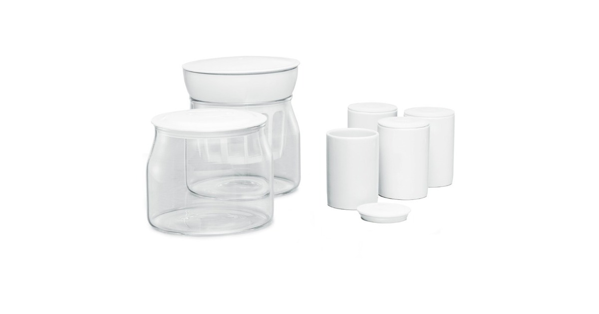4 Keramik Portionsbecher à 125 ml mit Deckel, 2 XXL Glasbehälter à 1,2 Liter mit Abtropfsieb und Deckel |