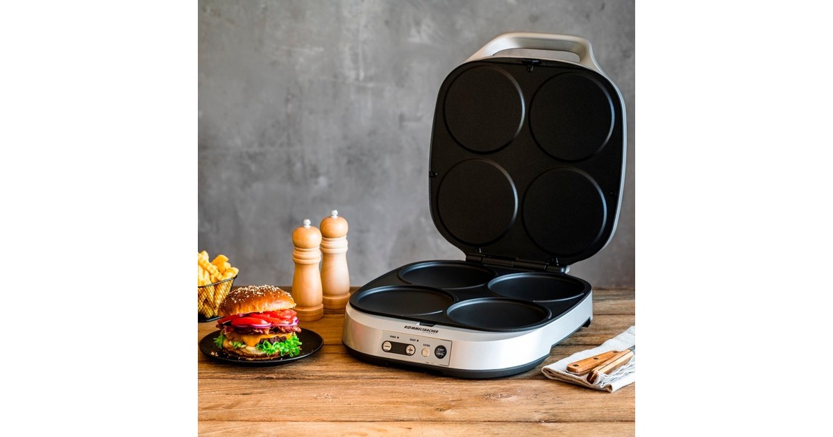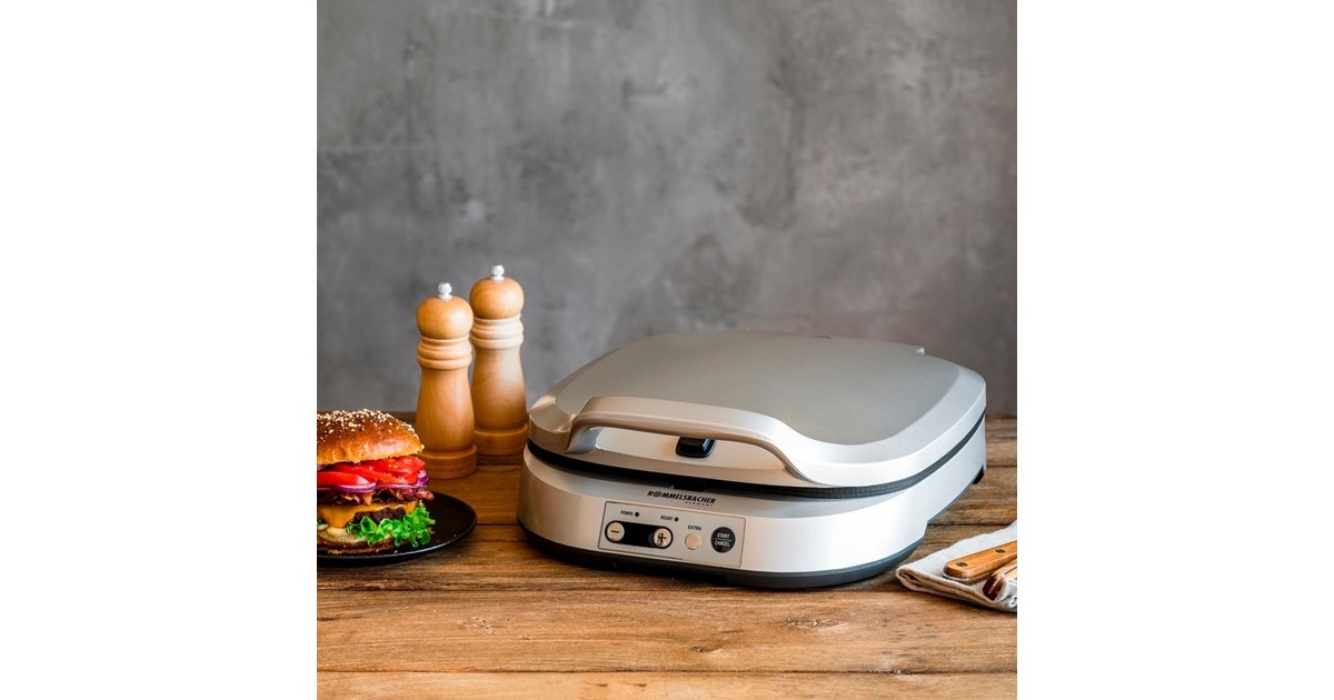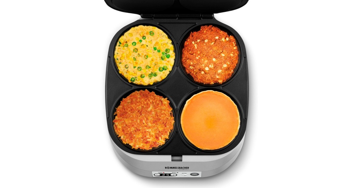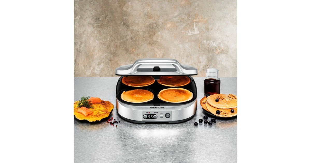 Mit dem vielseitigen Pancake Maker PC 1800 von Rommelsbacher lassen sich zeitgemäße Rezepte und beliebte Klassiker gleich im 4-er Pack backen. American Pancakes zum Frühstück, deftige Kartoffelpuffer zum Mittagessen und am Abend oder bei der Party bäckt der Pancake Maker PC1800 Pam herzhafte Burger Patties, die wahlweise aus Fleisch oder vegetarisch/vegan aus Gemüse gemacht sind. Das leistungsstarke Gerät heizt die vier großen, antihaftbeschichteten Backmulden in Minutenschnelle auf. Die Bedienung erfolgt bequem über Soft-Touch Tasten und das LED Display bietet guten Überblick. Die Aludruckguss Platten verteilen die Hitze optimal und sorgen für gleichmäßige Backergebnisse. Eine Zeitschaltuhr erlaubt die Einstellung von individuellen Backzeiten – passend zur Füllung - und die Nachbräun-Funktion erlaubt auf Tastendruck eine noch intensivere Röstung. Für Sicherheit im Gebrauch sorgen die automatische Abschaltung, das Cool Touch Gehäuse, ein Überhitzungsschutz und die rutschfesten Gerätefüße. Die hochwertige Antihaftbeschichtung ermöglicht zudem eine leichte Reinigung, anschließend kann der PC 1800 platzsparend senkrecht im Schrank verstaut werden.Art.-Nr.: 1900576