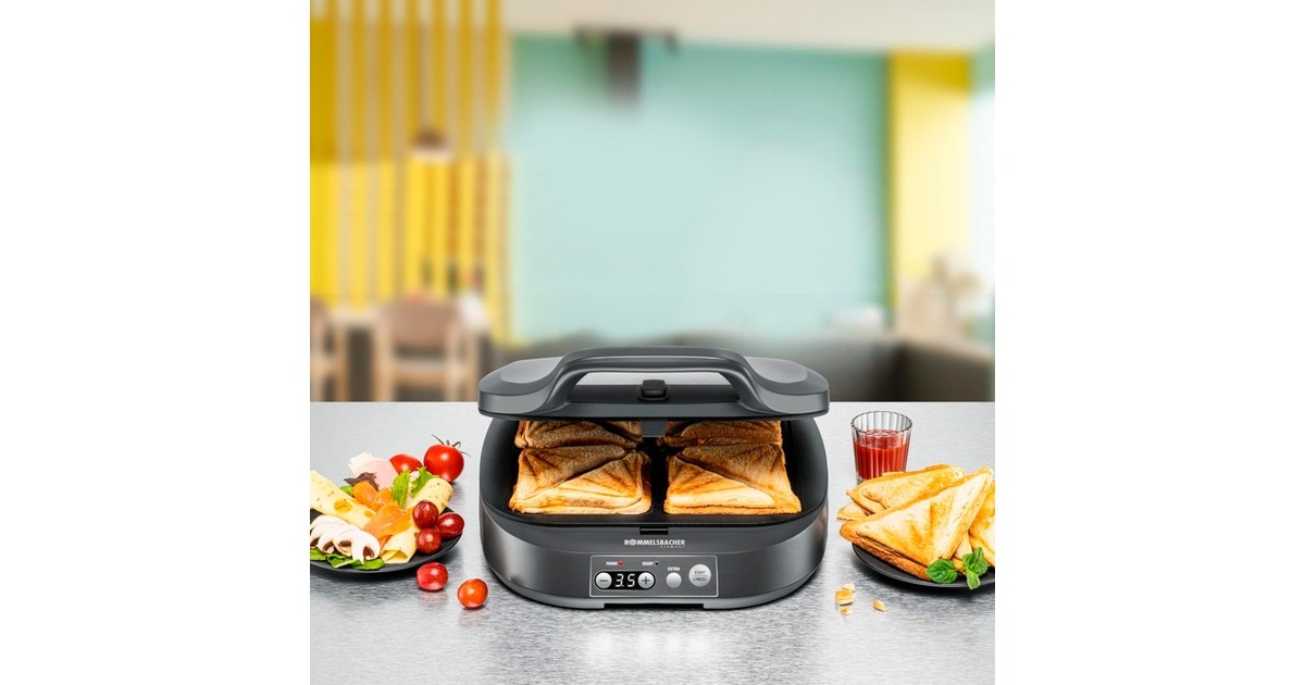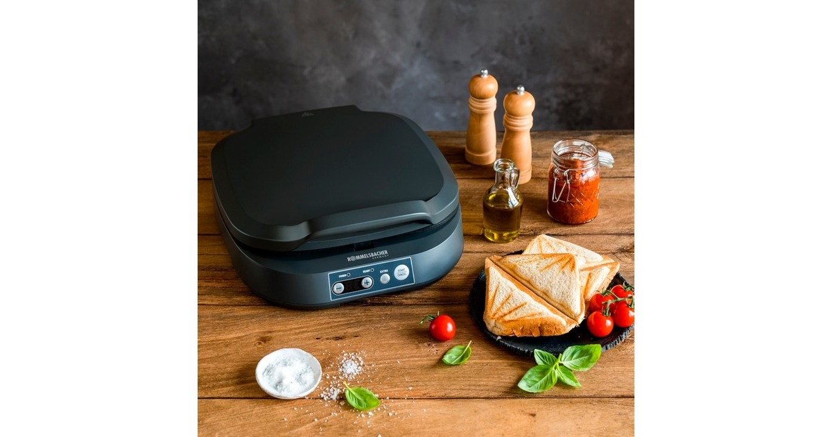 Der Sandwich Maker ST 1800 ist ein effektiver Küchenhelfer, der vier heiße Snackmahlzeiten gleichzeitig zaubert. Er ist perfekt, um schnell und komfortabel große, wie auch kleine Sandwich-Liebhaber mit knusprig-saftigen Sandwich-Spezialitäten zu erfreuen. Die antihaftbeschichteten Backmulden bieten viel Fläche für 4 American XL Sandwiches. Das leistungsstarke Gerät heizt in Minutenschnelle auf und ist einfach über Soft-Touch Tasten zu bedienen, das LED-Display bietet einen guten Überblick. Die Aludruckguss Toastplatten verteilen die Hitze optimal und sorgen für eine intensive Röstung in Muscheldesign auf den Toastscheiben. Eine Zeitschaltuhr erlaubt die Einstellung von individuellen Backzeiten und die Nachbräun-Funktion erlaub auf Tastendruck eine noch intensivere Röstung. Für Sicherheit im Gebrauch sorgen die automatische Abschaltung, das Cool-Touch Gehäuse, ein Überhitzungsschutz und die rutschfesten Gerätefüße. Die Antihaftbeschichtung ermöglicht zudem eine leichte Reinigung, anschließend kann der ST 1800 platzsparend senkrecht im Schrank verstaut werden.Art.-Nr.: 1900578