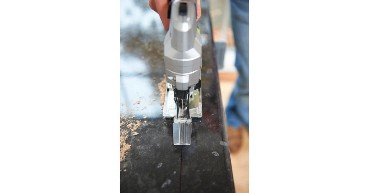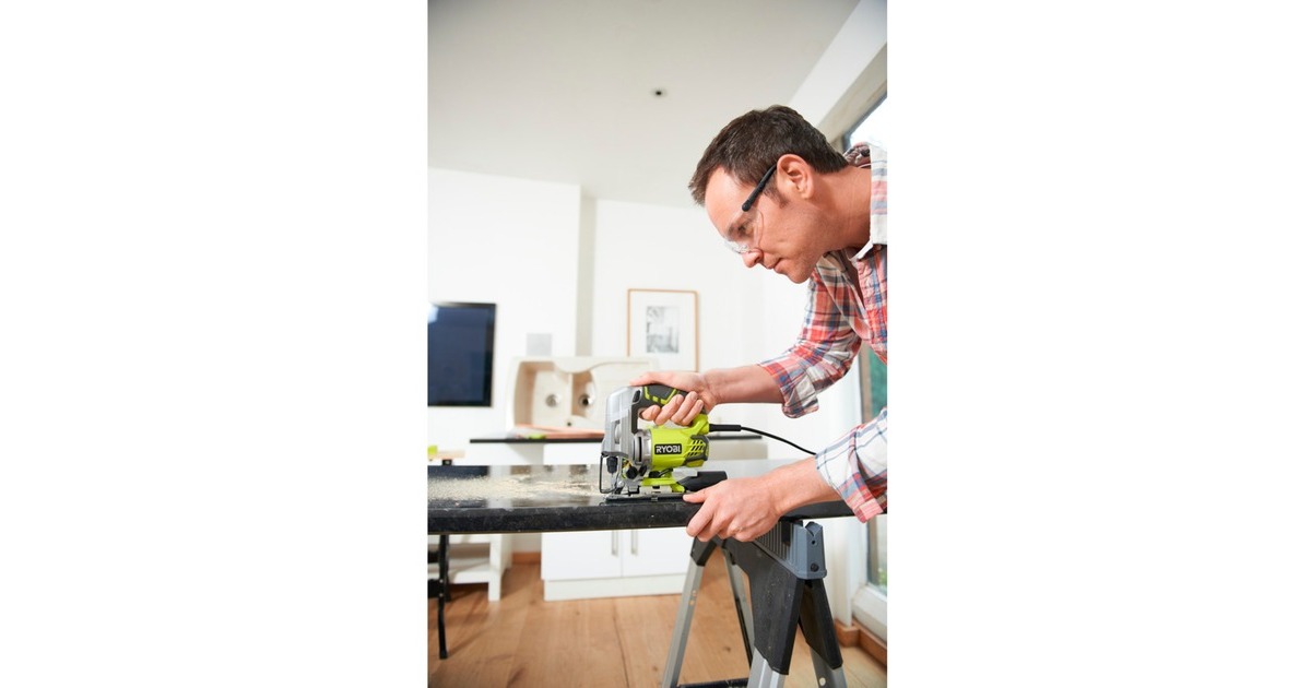 Die Ryobi Stichsäge RJS1050-K ist eine leistungsstarke Stichsäge mit innovativer Bauform für Schnitte in Holz bis 105mm. Sie überzeugt mit hohem Anwenderkomfort, exakten Schnitten, einem Sicherheitsschalter mit Einschaltsperre und herunterklappbarer Führungshilfe. Die Hubzahl lässt sich über das Einstellrad variabel regulieren, das ermöglicht jederzeit materialgerechtes Arbeiten. Der abschaltbare 4-Stufen-Pendelhub sorgt für optimale Schnittleistung. Das werkzeuglose Sägeblatt-Schnellwechselsystem ermöglicht den Sägeblattwechsel in Sekunden, dabei zeigt eine Farbcodierung, ob das Sägeblatt sicher verriegelt ist. Die zuschaltbare Spanblaseinrichtung und die LED-Beleuchtung sorgen für optimale Sicht auf die Schnittlinie. Die GripZone, das sind gummierte Anti-Vibrations-Griffflächen, bieten sicheren und komfortablen Halt. Die Bodenplatte ist aus stabilem Stahl gefertigt und lässt sich für Schrägschnitte werkzeuglos nach rechts und nach links neigen.Art.-Nr.: 1528348