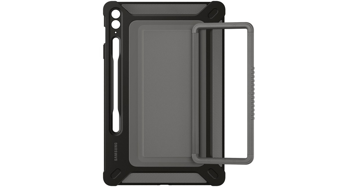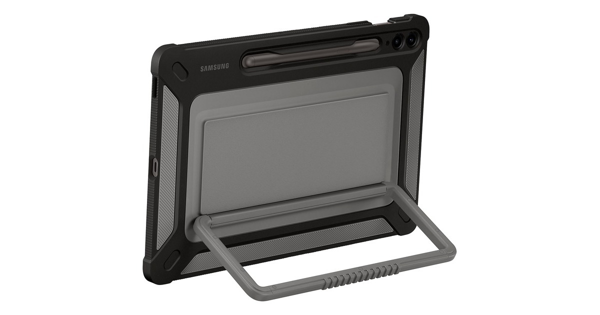 Auch bei wilden Outdoor-Abenteuern ein zuverlässiger Partner: Das Rugged Outdoor Cover ist nach militärischer Qualität (MIL-STD 810G-516.7) widerstandsfähig und kann das Tablet vor leichten Stürzen und bei Stößen schützen, wenn man unterwegs ist. Mit dem integrierten Standfuß auf der Rückseite des Covers kann man Inhalte auf dem Galaxy Tab S9 auch bequem im Querformat genießen. Außerdem kann man den Standfuß auch als Tragegriff nutzen, damit man das Tablet sicher in der Hand hat, während man unterwegs ist. Die integrierte S-Pen Halterung ist eine praktische Ergänzung, mit der man diesen stets schnell zur Hand hat.Art.-Nr.: 100020420
