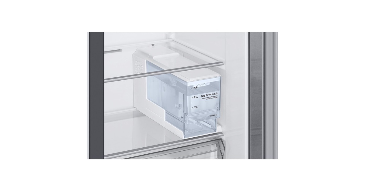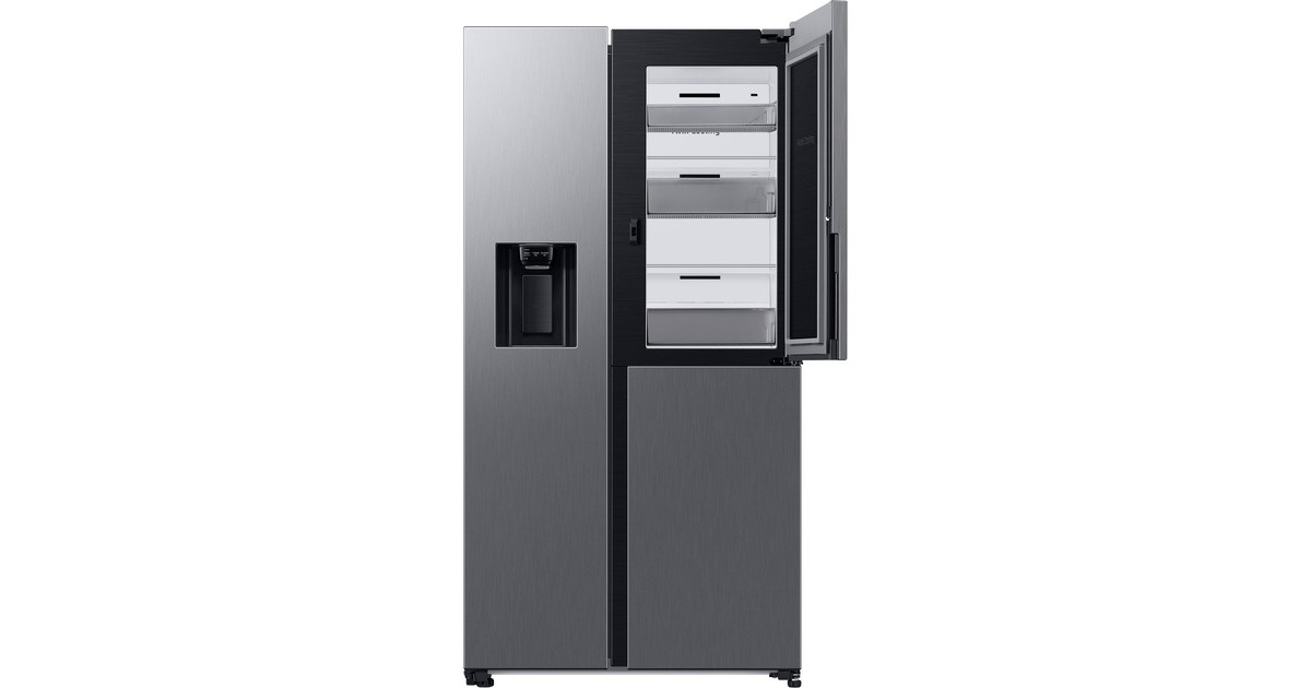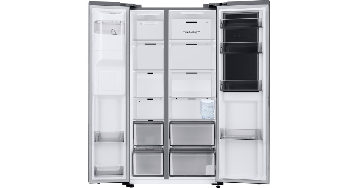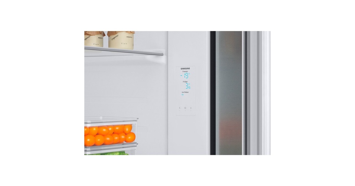 Der Side-by-Side Samsung RH68B8521S9/EG ist mit einem Gesamtnutzinhalt von 627 Litern optimal für den großen Familienhaushalt geeignet und überzeugt mit diversen Features. Im 403 Liter umfassende Kühlbereich haben frische Lebensmittel auf vier Abstellflächen, in zwei Obst-/Gemüseschubladen sowie in vier Türfächern jede Menge Platz, um übersichtlich gelagert zu werden. Die Food Showcase Tür ermöglicht einen schnellen und unkomplizierten Zugriff auf bevorzugte Getränke und Lebensmittel. Der Gefrierbereich mit NoFrost+ gegen Eis- und Reifbildung umfasst 224 Liter und ist ebenfalls mit vier Abstellflächen, zwei Gefriergutschubladen sowie zwei Türfächern ausgestattet. Zwei getrennte Kühlkreisläufe (Twin Cooling+) sorgen dafür, dass zwischen Kühl- und Gefrierbereich des RH68B8521S9/EG kein Luftaustausch stattfindet, wodurch die Geruchs- und Geschmacksübertragung von Kühl- in Gefrierteil reduziert wird und die trockene Luft im Gefrierteil nicht in den Kühlbereich gelangt. Der platzsparende In-Door-Icemaker mit integriertem 4,5 Liter Wassertank bietet gekühltes Wasser, Eiswürfel und Crushed Ice auf Knopfdruck. Darüber hinaus überzeugt der RH68B8521S9/EG unter anderem mit den Funktionen PowerFreeze- und PowerCool, einer Urlaubsschaltung sowie einem Smart Sensor und einem Digital Inverter Kompressor. Mit einem Stromverbrauch von 343 kWh im Jahr ist der RH68B8521S9/EG in die Energieeffizienzklasse E eingestuft.Art.-Nr.: 1910687