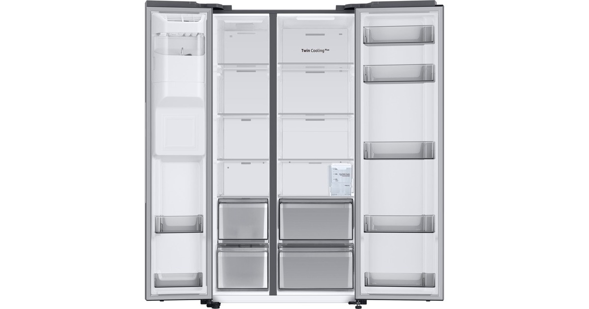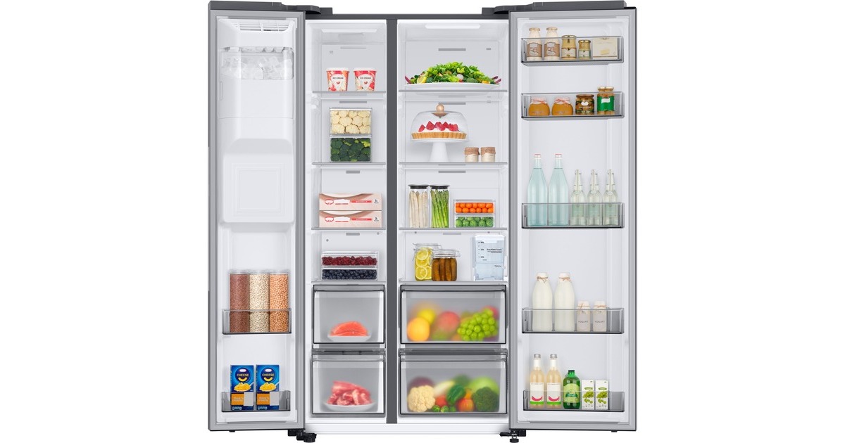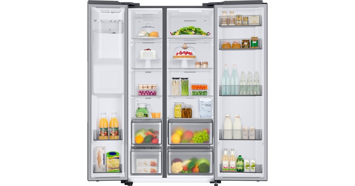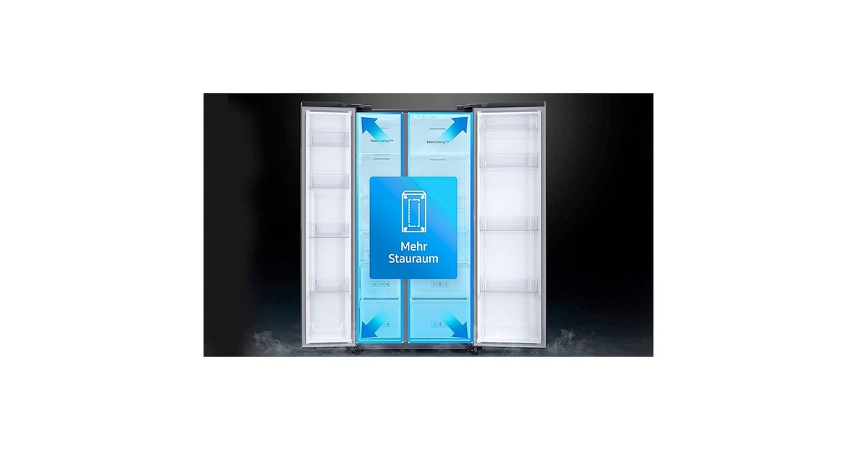 Der Side-by-Side Samsung RS6GA8521S9/EG ist mit einem Gesamtnutzinhalt von 634 Litern optimal für den großen Haushalt geeignet und überzeugt mit diversen Features. Im 409 Liter umfassende Kühlbereich haben frische Lebensmittel auf vier Abstellflächen, in zwei Obst-/Gemüseschubladen sowie in fünf Türfächern jede Menge Platz, um übersichtlich gelagert zu werden. Precise Cooling sorgt dafür, dass Lebensmittel länger frisch bleiben und ihren Geschmack und ihre Textur beibehalten. Der Gefrierbereich mit NoFrost+ gegen Eis- und Reifbildung umfasst 225 Liter und ist mit zwei Gefriergutschubladen sowie vier Abstellflächen und zwei Türfächern ausgestattet. Mit Smart Conversion ist man noch flexibler bei der Kühlung der Lebensmittel, denn dank Twin Cooling+ lassen sich beide Bereiche des RS6GA8521S9/EG separat ansteuern und man kann zwischen fünf verschieden Modi auswählen – zum Beispiel um das linke Gefrierfach als normales Kühlfach zu verwenden oder eine Seite auszuschalten um Energie zu sparen. Für den besonderen Komfort sorgt der In-Door Icemaker mit integriertem 4,5-Liter-Wassertank für Wasser, Eiswürfel und Crushed Ice auf Knopfdruck. Darüber hinaus überzeugt der RS6GA8521S9/EG unter anderem mit PowerFreeze- und PowerCool-Funktion, Urlaubsschaltung sowie einem Smart Sensor. Alle Einstellungen lassen sich über die leicht zugänglichen Bedienknöpfe vornehmen, welche auch von einem Rollstuhl aus zu erreichen sind. Mit einem Stromverbrauch von 351 kWh im Jahr ist der RS6GA8521S9/EG in die Energieeffizienzklasse E eingestuft.Art.-Nr.: 1874440