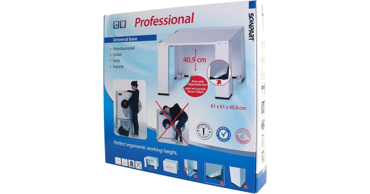 Waschmaschinen und Trockner stehen sehr häufig in Kellerräumen. Hier sind unebene Böden oft ein Problem. Der Unterbausockel von Scanpart verfügt über vier einzeln verstellbare Füße und kann somit optimal ausgerichtet werden. Er erleichtert außerdem das Befüllen und Entladen und schafft zusätzlichen Stauraum. Je nach Präferenz kann man auch die geschlossene Wand nach vorne richten.Art.-Nr.: 1718052