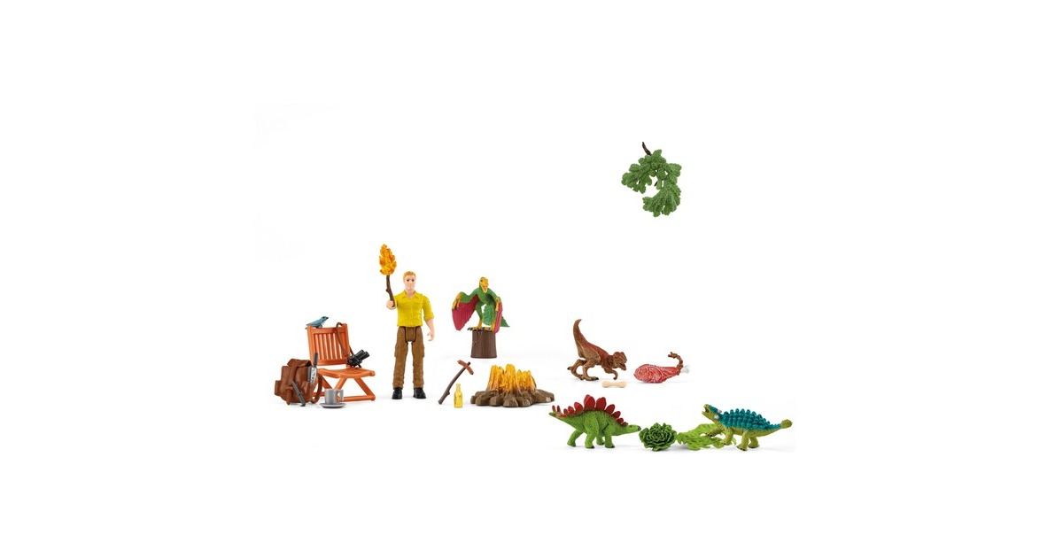 1x Luis, 1x Lagerfeuer, 1x Blauer Vogel, 1x Becher, 1x Rucksack, 1x Baby Stegosaurus, 1x Saichania, 1x Stock mit Wurst, 1x Teller, 1x Mopane Blätter, 1x Köder, 1x Archaeopteryx, 1x Campingstuhl, 1x Fackel, 1x Satellitentelefon, 1x Salat, 1x Messer, 1x Flasche, 1x Fernglas, 1x Velociraptor, 1x Akazien-Blätter mit Ast, 1x Baumstamm, 1x Knochen, 1x Baby T-Rex |