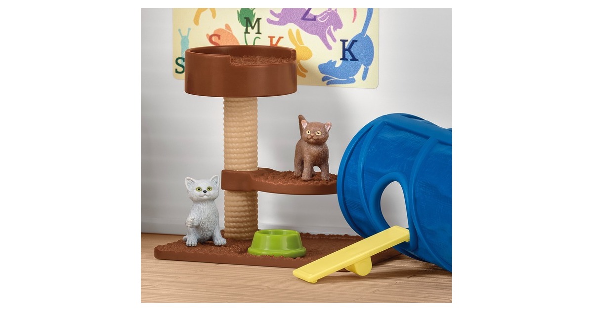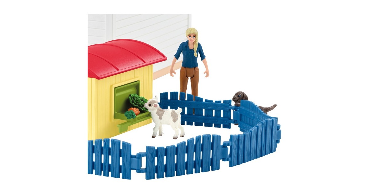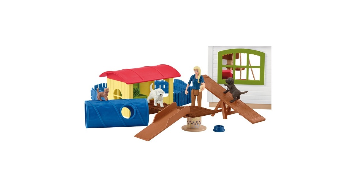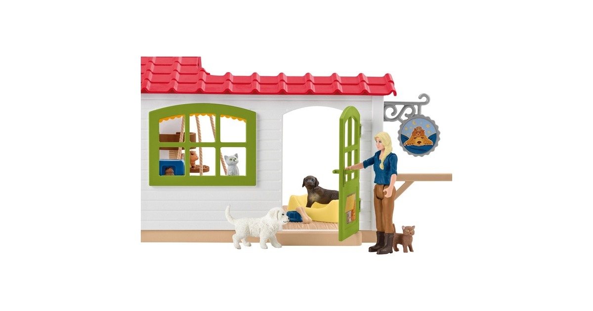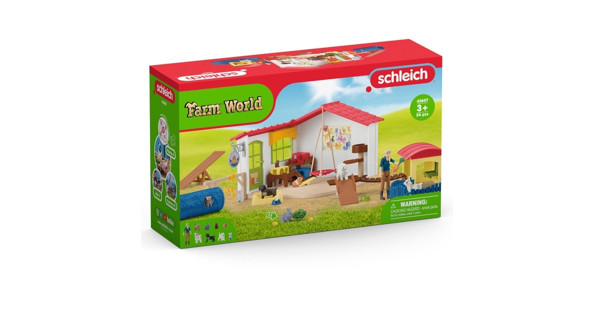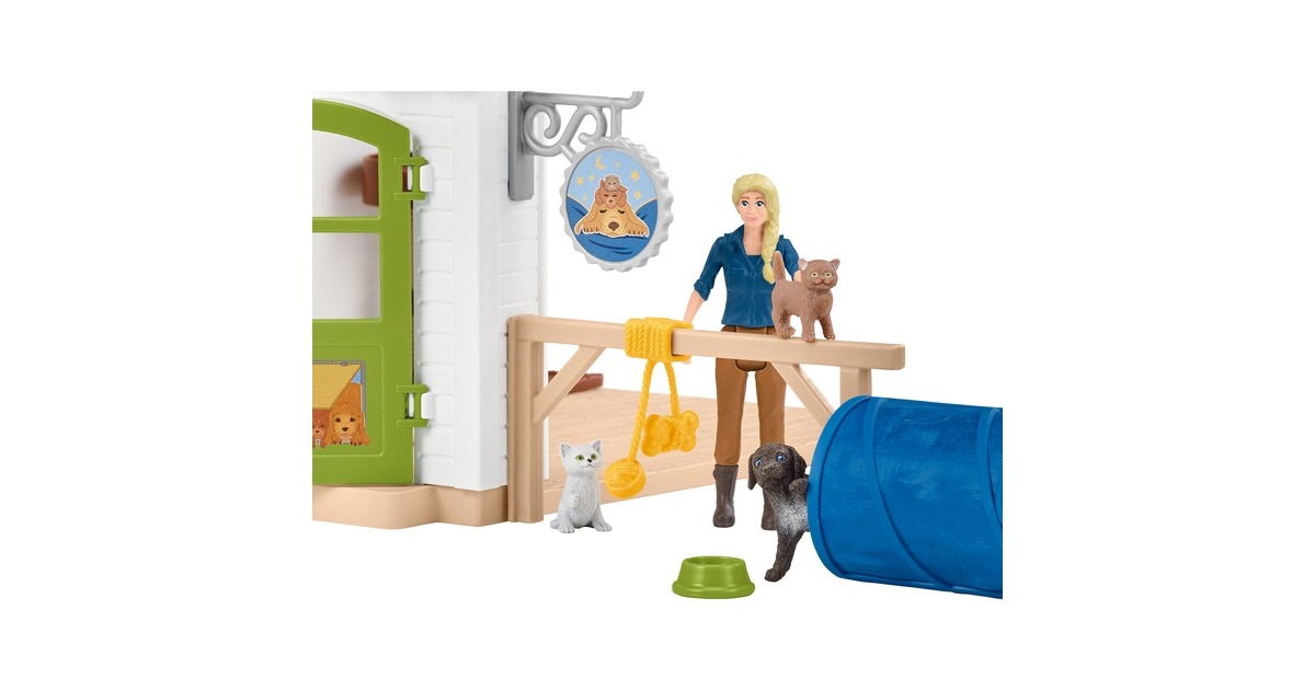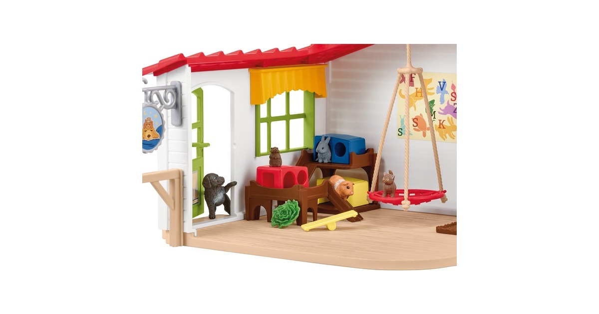 Spaß für jeden Geschmack bietet dieses tolle Tierhotel aus Schleichs Themenwelt Farm World. Die Welpen toben auf dem Hundeparcours herum, die Katzen mögen den Kratzbaum besonders gern. Hamster, Hase und Meerschweinchen spielen in ihren kleinen Höhlen Verstecken. Und wer traut sich auf die Tierschaukel? Das Meerschweinchen hat mit der kleinen Wippe schon einiges zu tun. Das Zicklein schaut dem bunten Treiben neugierig zu und gibt hin und wieder meckernd seinen Kommentar dazu ab. Wenn die Tiere von einem Spielelement genug haben, tauscht die Pflegerin sie einfach aus und baut sie neu zusammen. So wird es nie langweilig. Mit den beiliegenden Stickern kann das Tierhotel ganz nach Wunsch dekoriert werden.