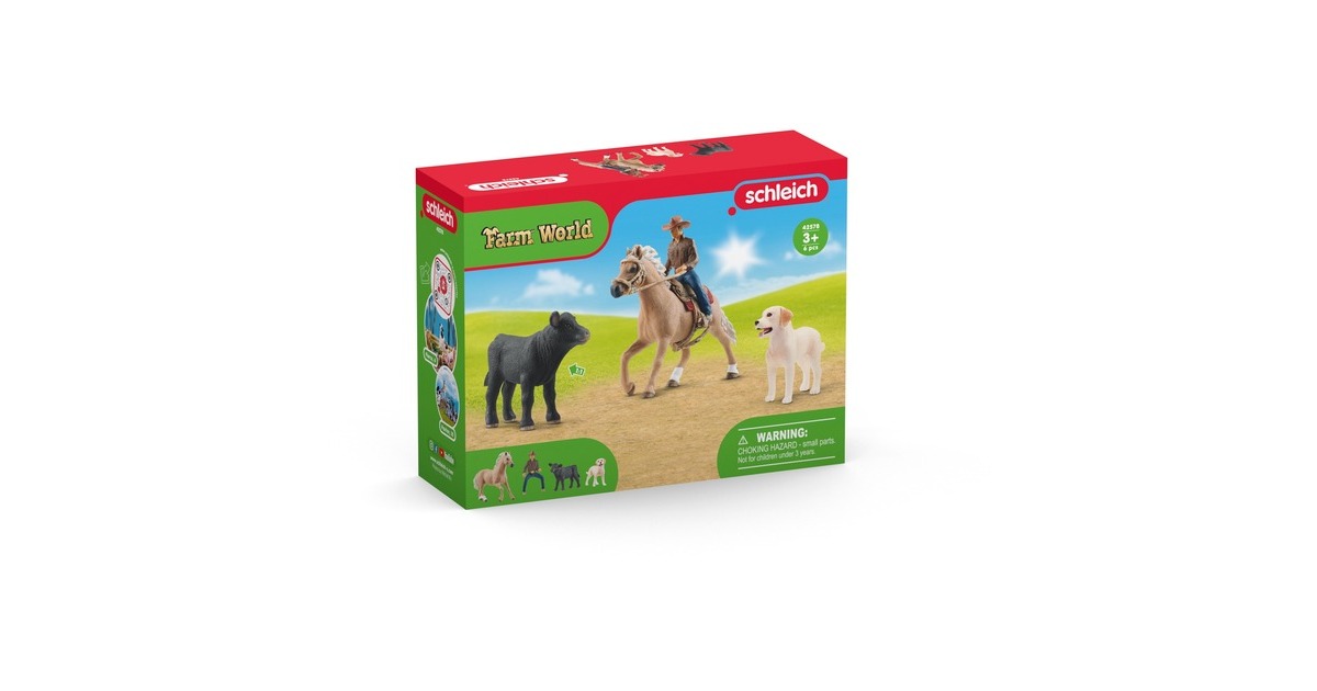 1 Cowboy, 1 Quarter Horse, 1x Zügel und Zaumzeug, 1 Westernsattel, 1 Labrador Retriever Hündin, 1 Black Angus Kalb |