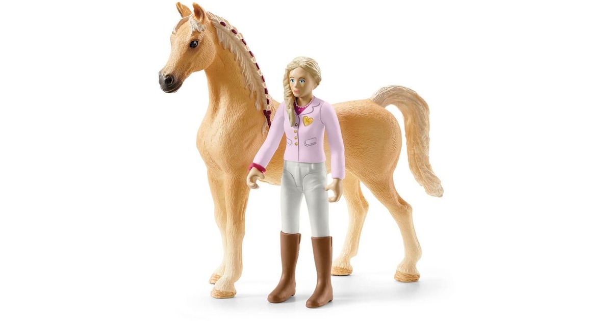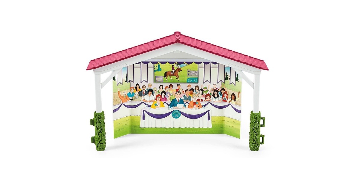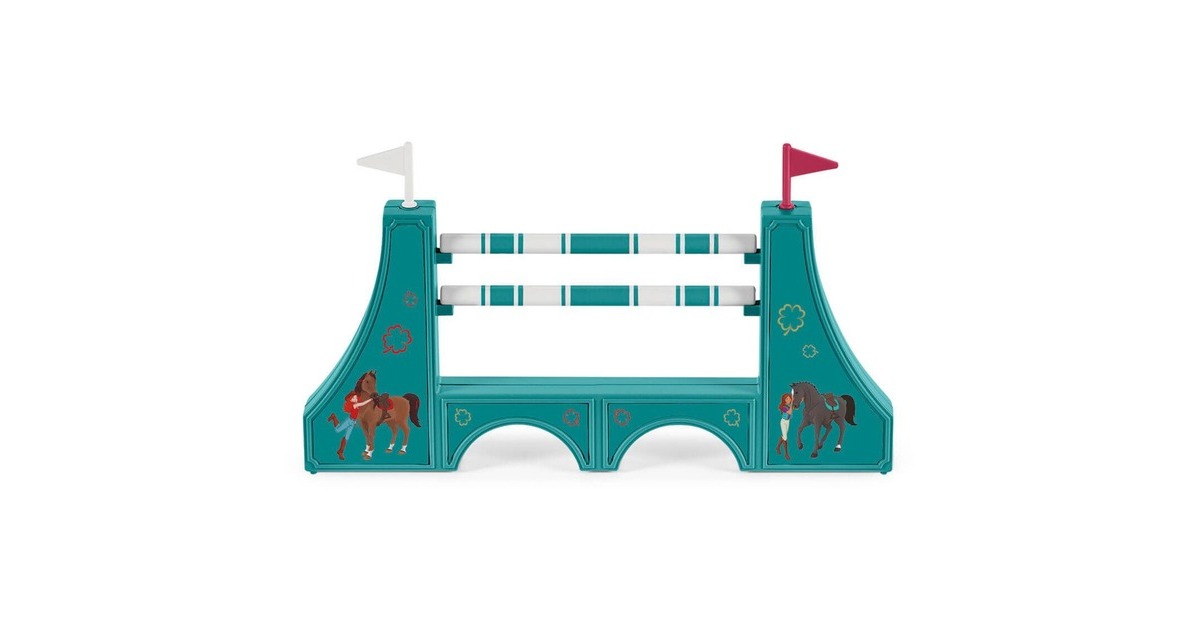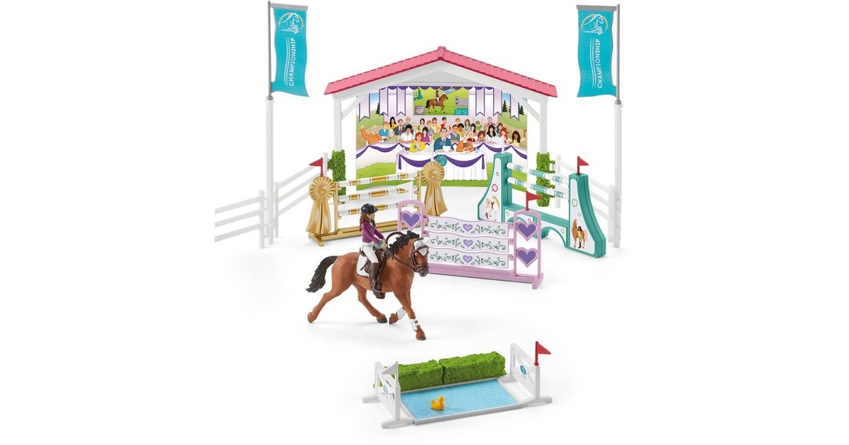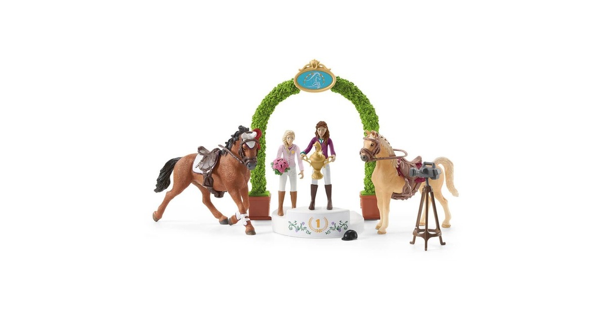 Beim Freundschaftsturnier von Schleich Horse Club reiten Sofia und Lisa eine Araber- und eine Trakehner-Stute. Die vielfältigen Spielfunktionen und das umfangreiche Zubehör sorgen für großartigen Spielspaß: Die voll beweglichen Mädchenfiguren machen die Tiere in der Pferdebox mit Kardätsche und Hufkratzer sauber und legen ihnen Sattel und Zaumzeug an. Bevor sie losreiten, setzen sie noch ihre Helme auf. Der Parcours ist mit Zäunen umgeben und führt über zwei Steilsprünge. Einer ist mit Herzen verziert und der andere mit goldener Farbe bemalt. Beim gefürchteten Wassergraben ist Konzentration gefragt. Zwei Fahnen flattern im Wind, und plötzlich flitzt eine Maus hinter die Strohballen! Die Zuschauer auf der Tribüne sind aufgeregt vor Spannung. Lassen sich die Pferde verunsichern? Nach dem Turnier werden auf dem Siegerehrungspodium ein Blumenstrauß und Siegerschleifen übergeben. Mit Kamera und Stativ werden tolle Erinnerungsfotos gemacht.Art.-Nr.: 1832589