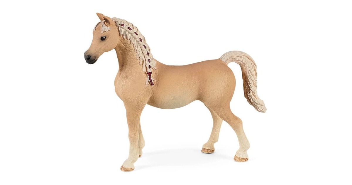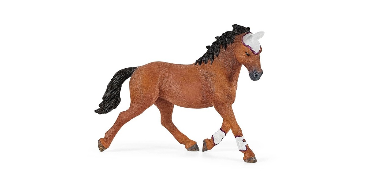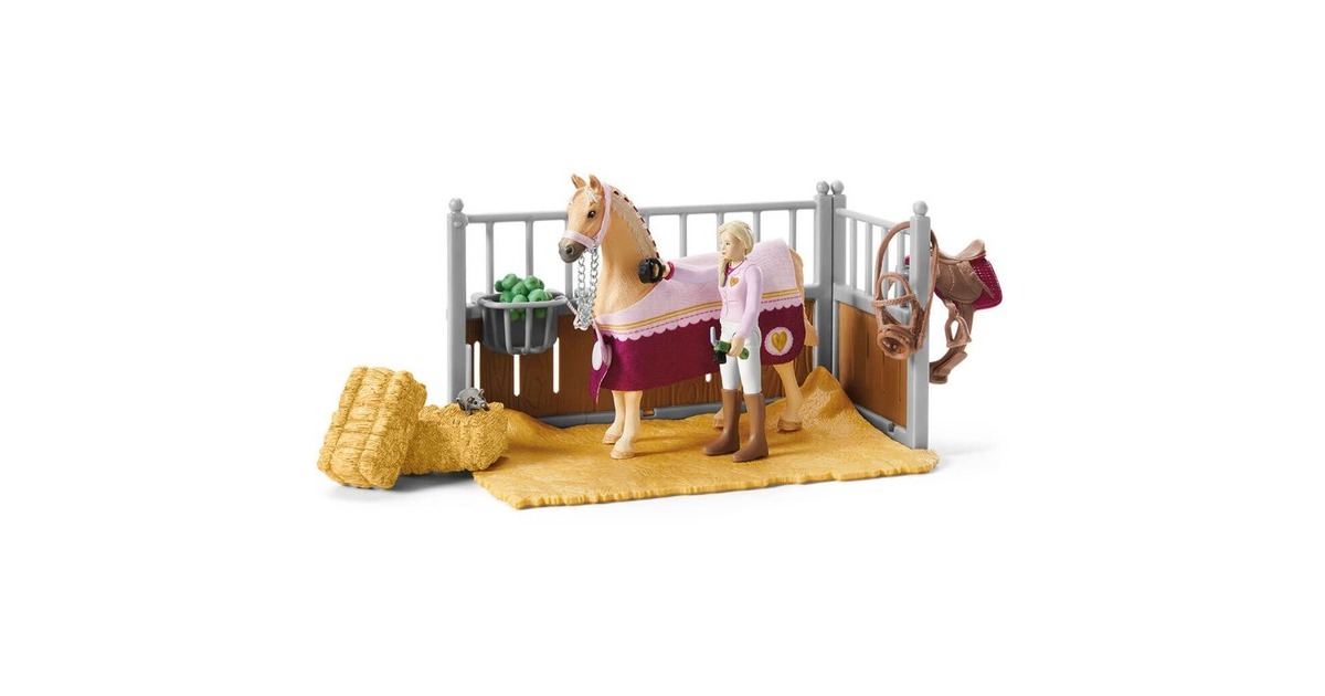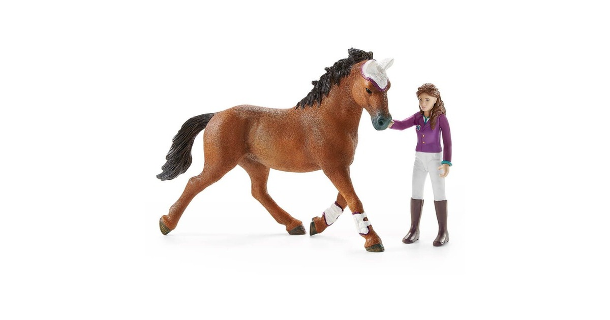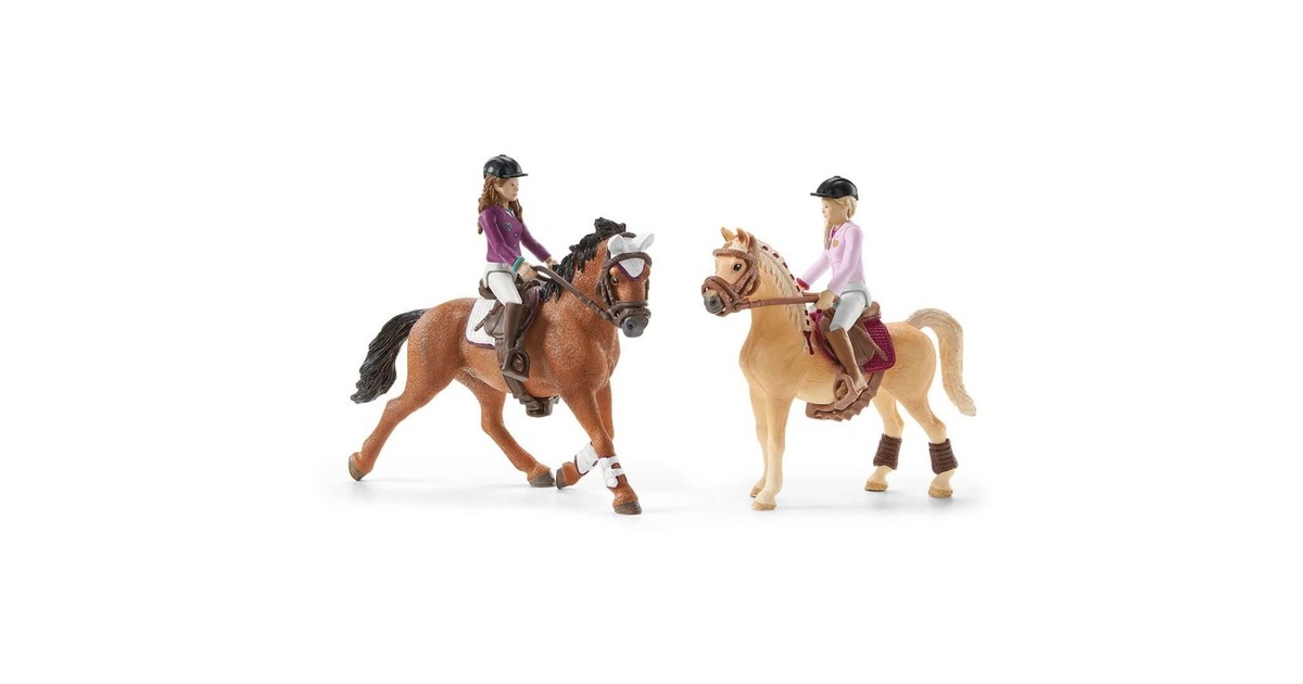 Beim Freundschaftsturnier von Schleich Horse Club reiten Sofia und Lisa eine Araber- und eine Trakehner-Stute. Die vielfältigen Spielfunktionen und das umfangreiche Zubehör sorgen für großartigen Spielspaß: Die voll beweglichen Mädchenfiguren machen die Tiere in der Pferdebox mit Kardätsche und Hufkratzer sauber und legen ihnen Sattel und Zaumzeug an. Bevor sie losreiten, setzen sie noch ihre Helme auf. Der Parcours ist mit Zäunen umgeben und führt über zwei Steilsprünge. Einer ist mit Herzen verziert und der andere mit goldener Farbe bemalt. Beim gefürchteten Wassergraben ist Konzentration gefragt. Zwei Fahnen flattern im Wind, und plötzlich flitzt eine Maus hinter die Strohballen! Die Zuschauer auf der Tribüne sind aufgeregt vor Spannung. Lassen sich die Pferde verunsichern? Nach dem Turnier werden auf dem Siegerehrungspodium ein Blumenstrauß und Siegerschleifen übergeben. Mit Kamera und Stativ werden tolle Erinnerungsfotos gemacht.Art.-Nr.: 1832589